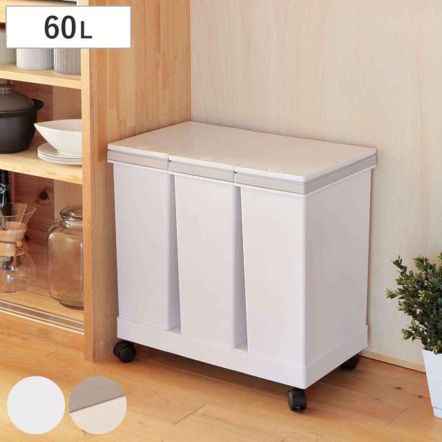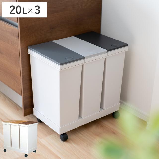 ゴミ箱 60L 資源ゴミ 横型 3分別ワゴン ( ごみ箱 60リットル 20L 3個 セット ワンプッシュ 台座付き 分別 キッチン ふた付き 20リットル おしゃれ シンプル 押しふた 3分別 室内 台所 リビング ホワイト 白 ブラウン スリム )