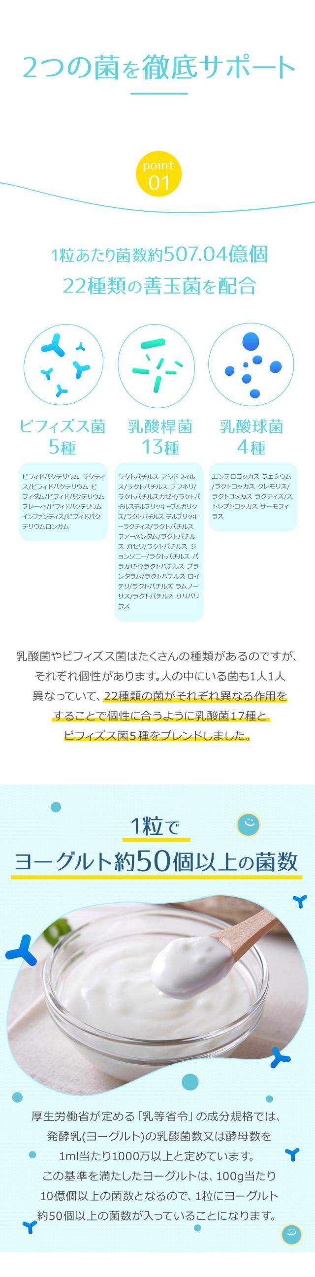 主要原料(1粒あたり):フラクトオリゴ糖 40mg / 殺菌乳酸菌 10.54mg
