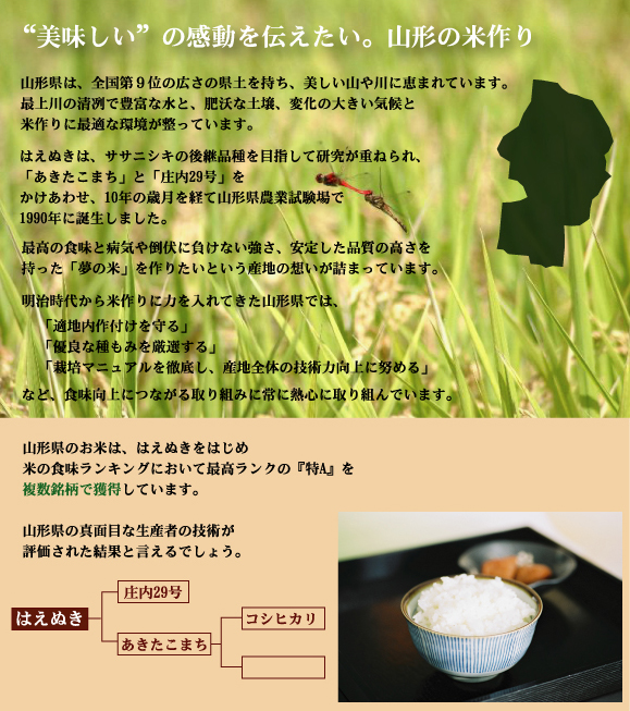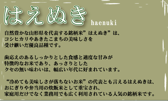 はえぬきは、父「あきたこまち」と母「庄内29号」を親に、山形県農業試験場で生まれた品種です。あきたこまち同様、粘りに富み、冷めても美味しいお米です。