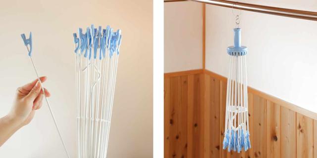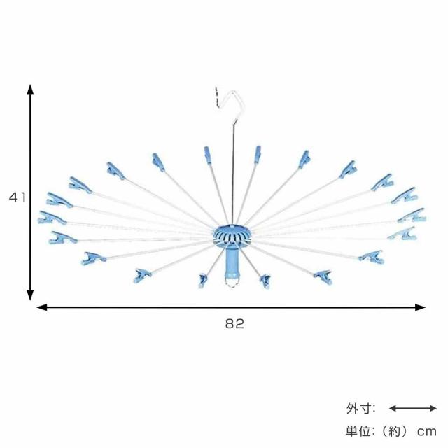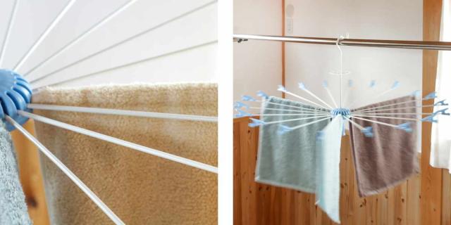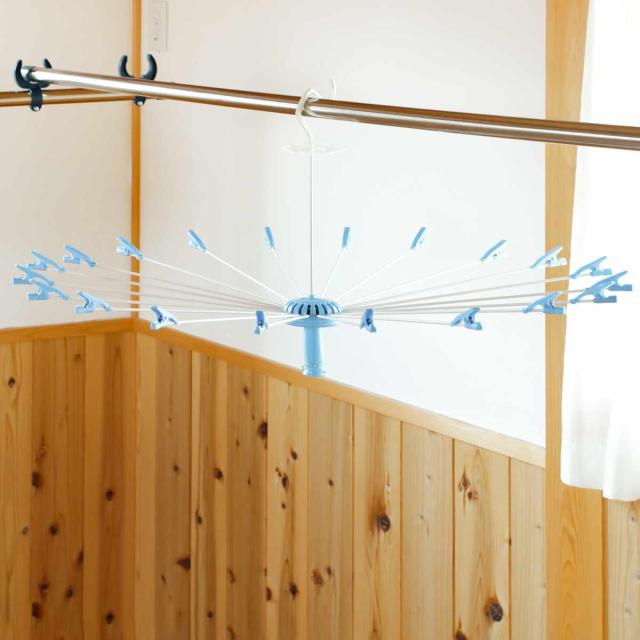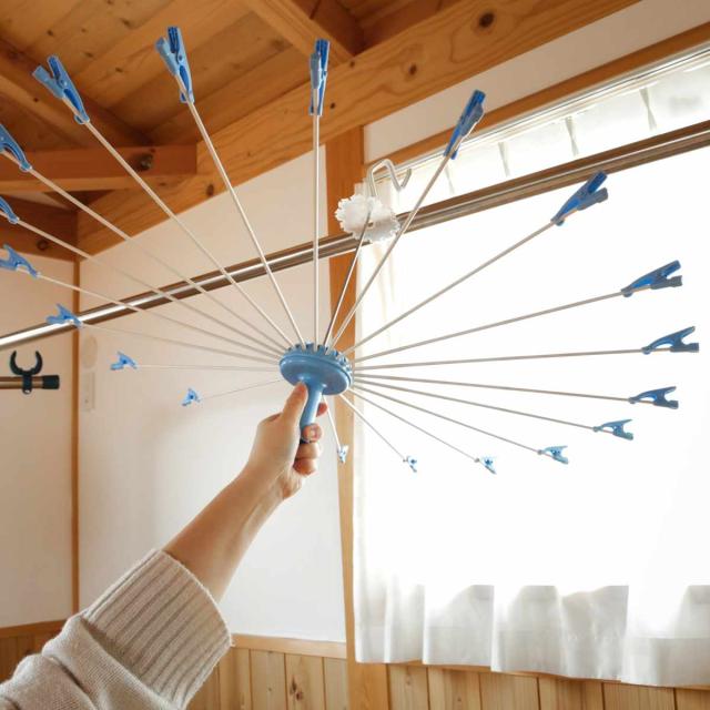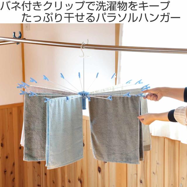 フェイスタオルを20枚干すことができるパラソルハンガーです。アームの先端にはバネ付きクリップが付いているので、洗濯物をしっかりとめることができ、外干しの際も安心です。