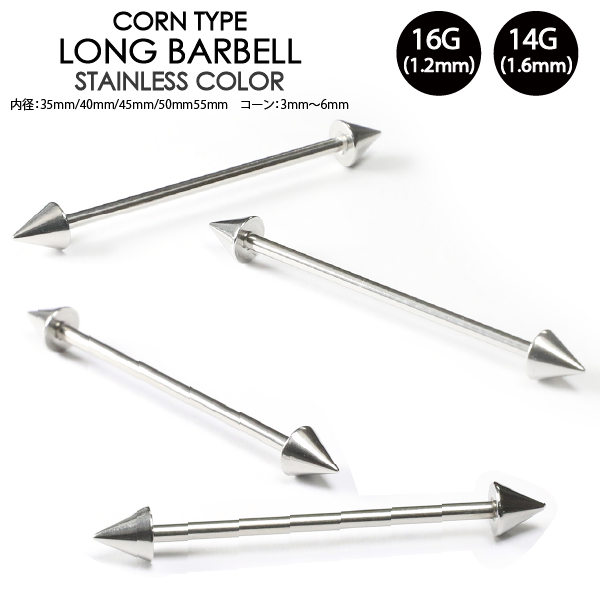 【メール便対応】ボディピアス ロング バーベル コーン スパイク 14G(1.6mm) 16G(1.2mm) サージカルステンレス316L ストレート 定番 インダストリアル ボディーピアス 軟骨 ┃