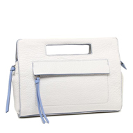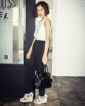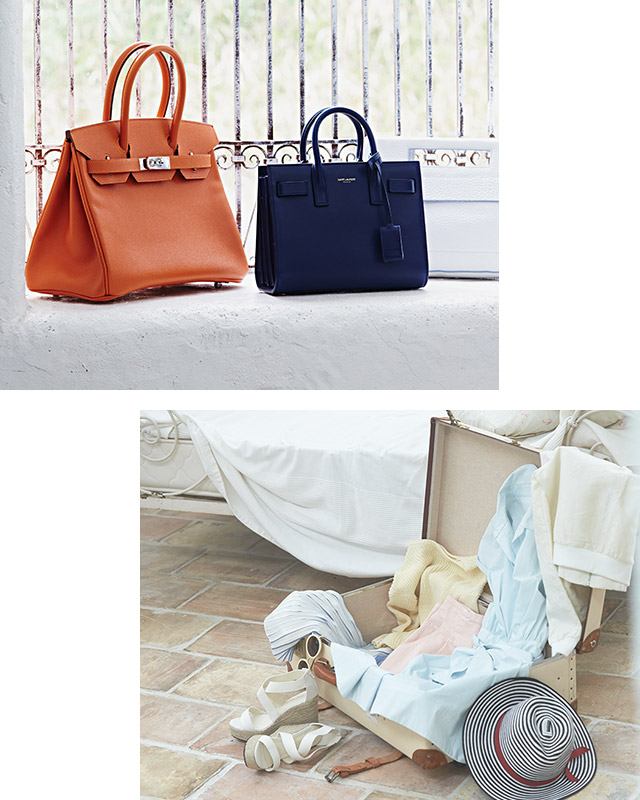 ハット サングラス レースブルゾン ウェスト絞りワンピース ウェッジソールサンダル ハンドバッグ ブルー系バッグ ホワイト系バッグ