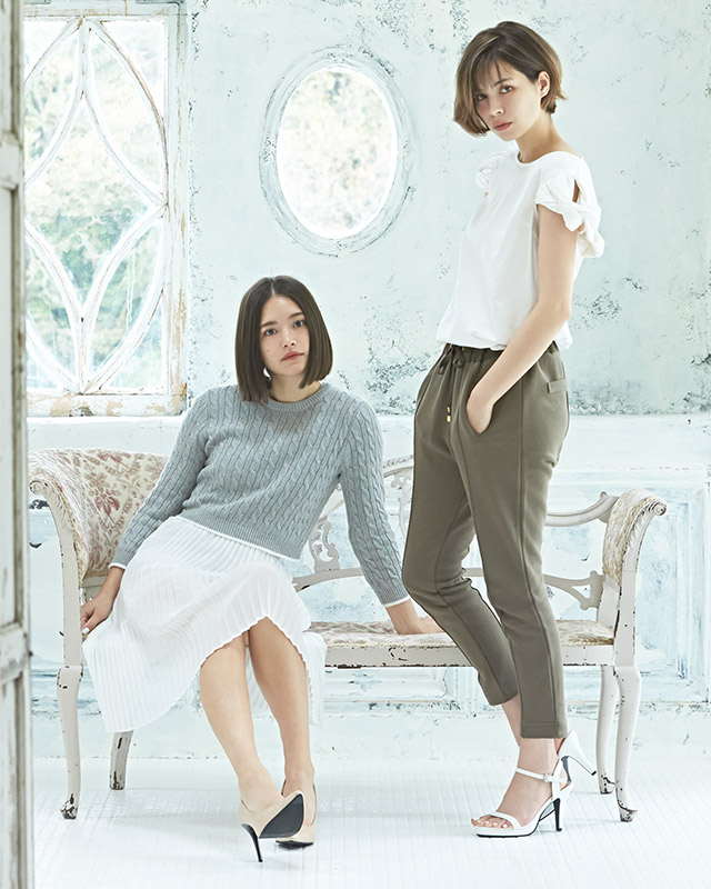 ブラウス スウェットボトム ストラップ付サンダル グレーニット シフォンスカート ポインテッドトゥパンプス