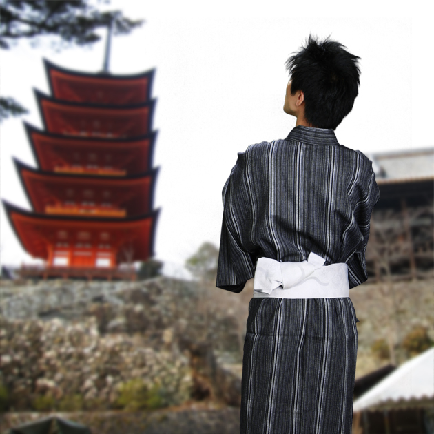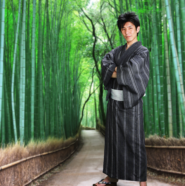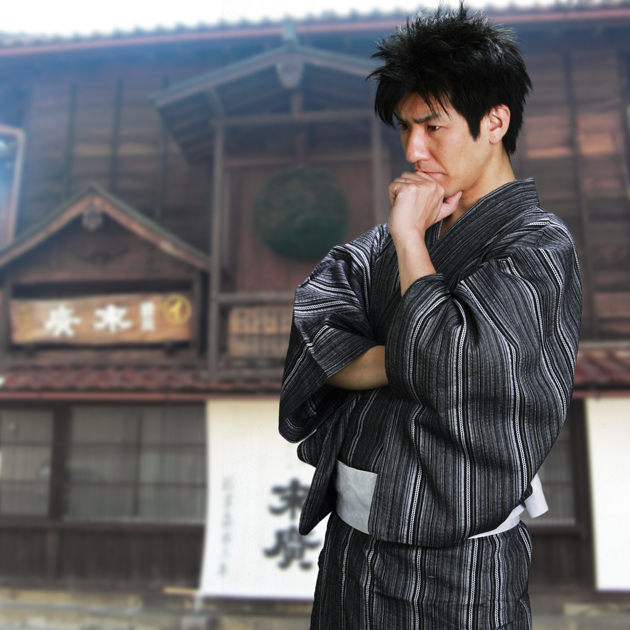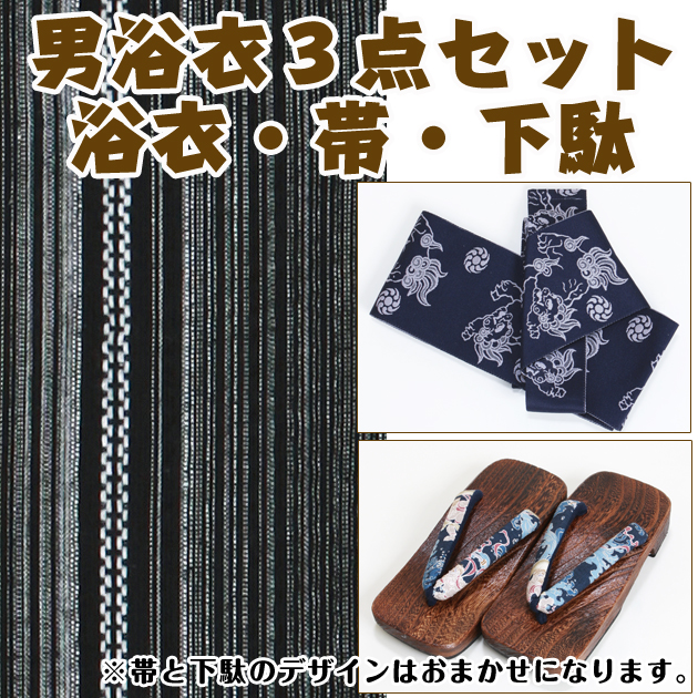 浴衣 男性 レンタル NT-my104 浴衣3点セット☆浴衣・帯・下駄☆グレー色/しじら織 縞 定番 送料無料