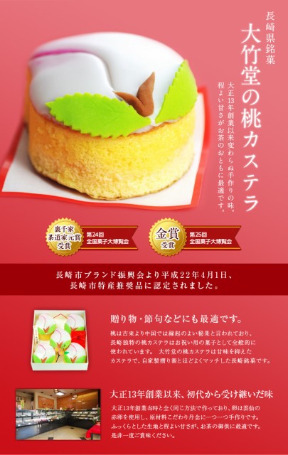 茶道家元賞を受賞した大竹堂の桃カステラです。大正13年創業以来、初代から受け継いだ味を守って作っています。贈り物・節句などに最適です。