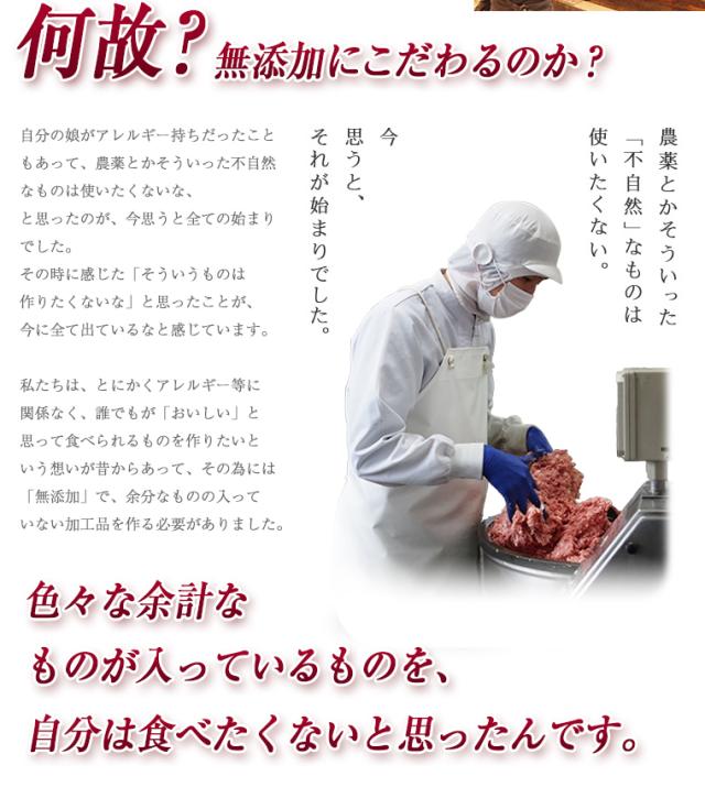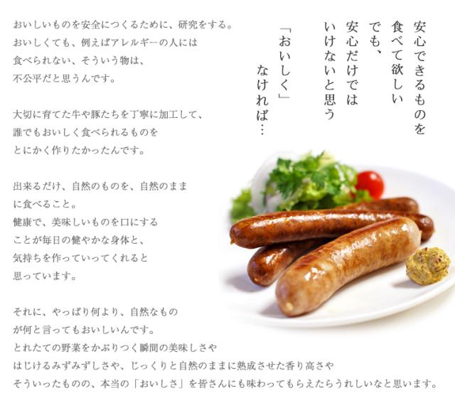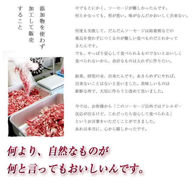 添加物を使わないと製造が難しいと言われるソーセージですが、何度も失敗を繰り返し、無添加での製造を実現しました。一般的なソーセージとは色も食感も異なりますが、それは無添加の証です。愛媛県産の豚肉と安心できる食材だけを使った、安心・安全にこだわったソーセージです。本商品は荒挽きの豚もも肉を羊腸に詰めた、日本で親しまれているソーセージです。原材料も豚肉と塩、三温糖、香辛料のみで、シンプルに仕上げています。