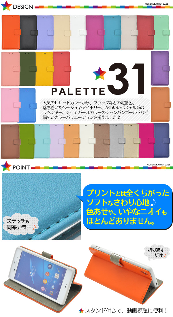 | 31色展開のXperia Z3用カラーレザーケースポーチ。 人気のイエローやオレンジなどのビビッドカラーから、ホワイト、ブラックなどの定番色、 落ち着いたベージュやアイボリー、かわいいパステル系のラベンダー、 そしてパールカラーのシャンパンゴールドやコパーなど 幅広い層に対応する、31色のカラーバリエーションを揃えました♪ ホワイトのレザーをプリンターで印刷した、プリント商品ではないので、 プリントのズレや色褪せなどもなく、細部まで美しいレザー質感と鮮やかなカラーを実現! また、ステッチも同系カラーを採用しています。 内部はソフトケースなので着脱が簡単! カラーもレザーの色にあったケースを使用しています。 背面を折り返すとスタンドとして使用できるので、動画視聴に便利です。 横開きタイプなので、手帳のように使うことができます。 内側に3つのカードポケットとサイドポケットが付いています。 ※006、016、029の内側のカラーは本体と同じ色になります。 | ||||||||||