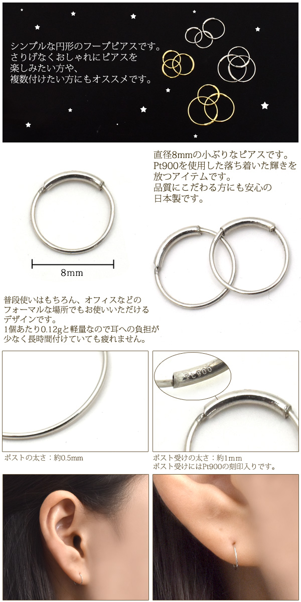 ピアス 片耳売り 直径8mm 日本製 プラチナ素材 Pt900 シームレスピアス シンプル パイプ フープピアス 普段使い イヤーロブ ファッションピアス サークル 送料無料