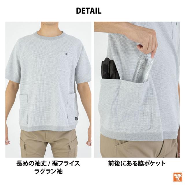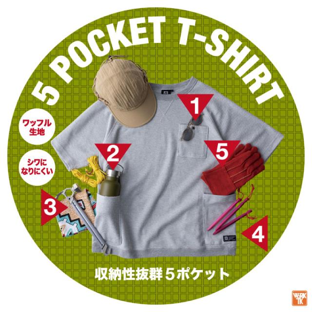 ワッフル生地の点接触でサラサラ触感の収納性抜群5ポケットTシャツ。