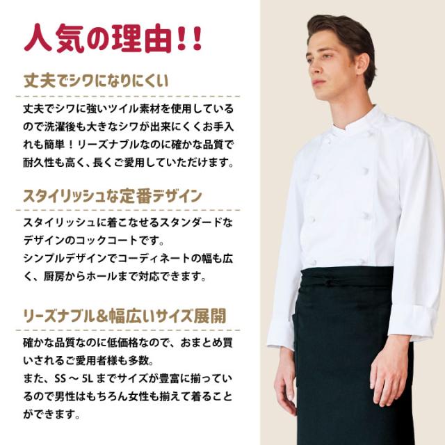 [大人気・定番] コックコート AS7300 低価格・高品質で人気の長袖コックコート 組紐ボタン メンズ レディース 男女兼用