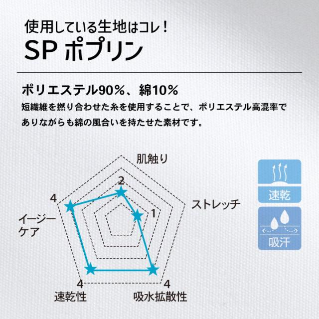 使用している生地は、ポリエステルと綿の短繊維を撚り合わせた糸を使用することで、ポリエステル高混率でありながらも綿の風合いを持たせた生地に。