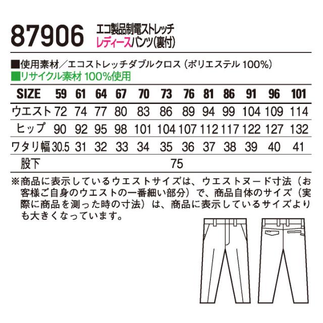 自重堂 レディース パンツ 春夏 再生PET リサイクル素材 帯電防止 JIST8118規格適合 SDGs エコ ストレッチ 仕事服 作業着 作業服 おしゃれ ズボン jd-87906