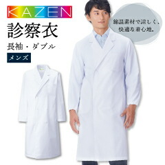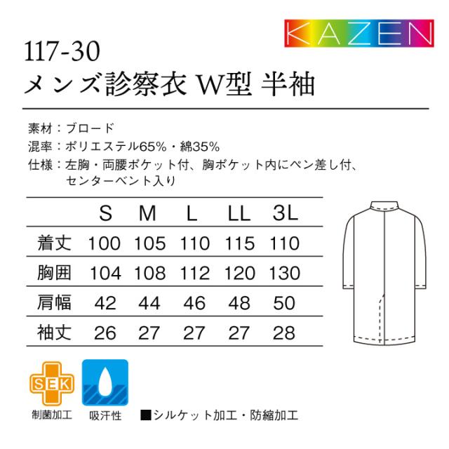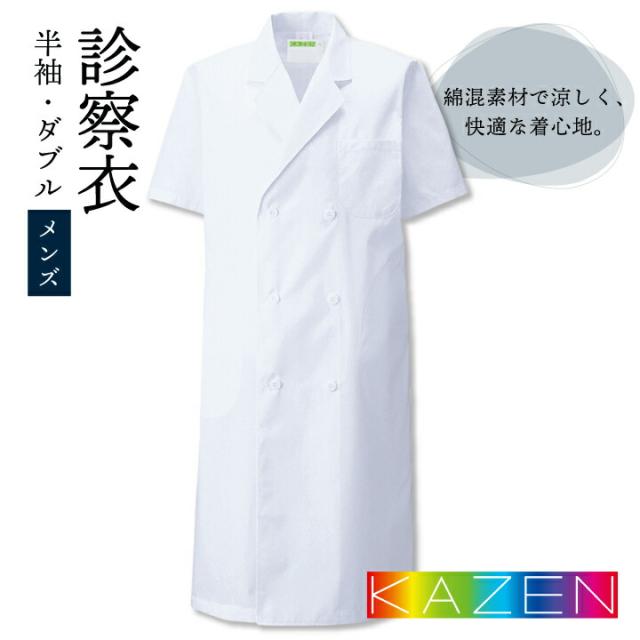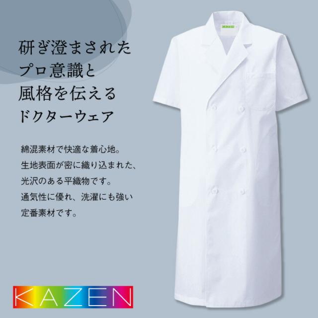 KAZEN 117-30 綿混素材で涼しく快適な着心地。 ドクターコート 半袖 診察衣 SEK制菌加工 吸汗性 シルケット加工 防縮加工 ダブルタイプ Sから3L 男性用