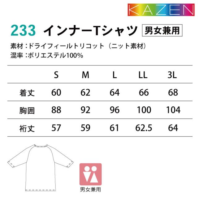 KAZEN 吸汗速乾性に優れたスクラブ用インナー。 七分袖 ニット素材 男性 女性 ユニセックス 233-05 233-08 233-11