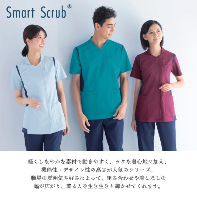 動きやすさ、収納性など機能を高めた前開きスクラブは、衿の高さやポケット等、仕様にもこだわっており、ショルダーから脇にかけての切り替え配色で、スマートに着こなせます。