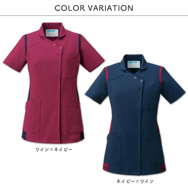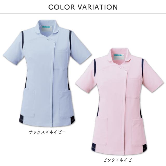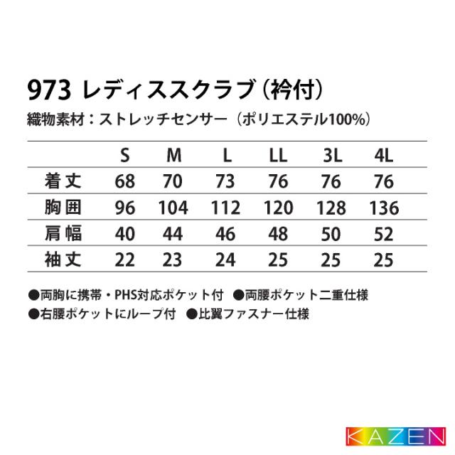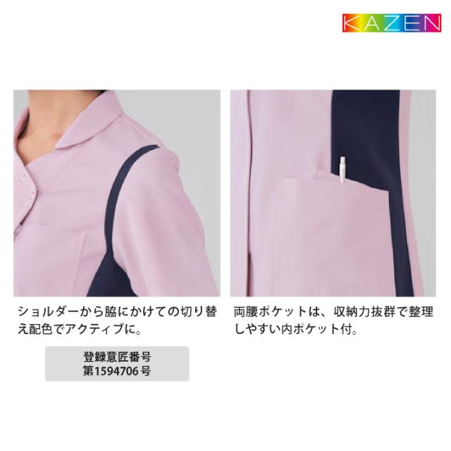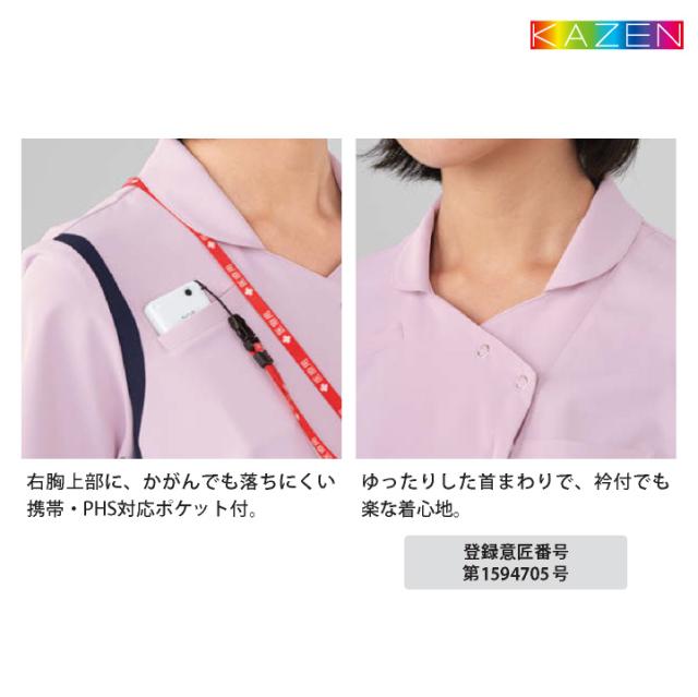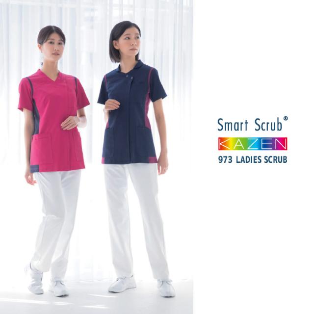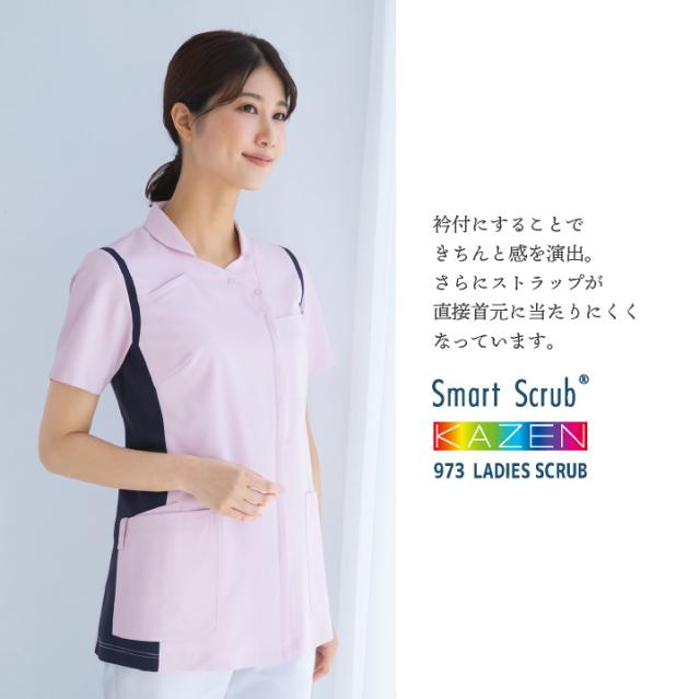 973 KAZEN レディススクラブ きちんと感を演出する衿付きデザイン。 脇の配色でよりスッキリとしたスタイルに。 透け防止 工業洗濯対応 吸汗性 制電 ストレッチ