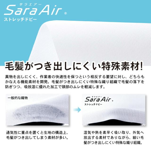 ムレにくく毛髪がつき出しにくい特殊素材。 長い髪もキレイに収まる設計。 ケープ付 メガネ差し付 吸収ニット 制菌加工 透け防止 吸汗速乾 制電 男女兼用 9-1501 9-1502 9-1503 9-1505