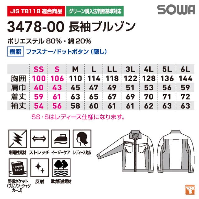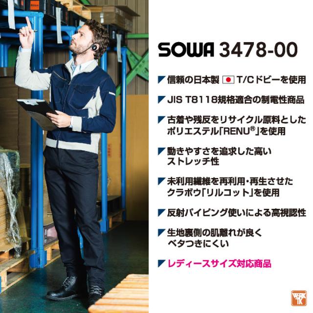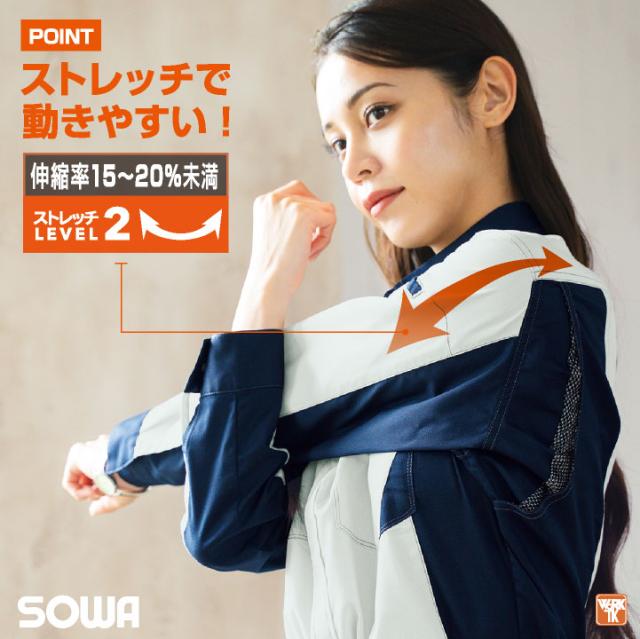 SOWA 長袖 ブルゾン 春夏 ストレッチ 制電 JIS T8118適合品 ジャケット ジャンパー 作業着 作業服 ユニフォーム 企業 制服 法人向け SDGs メンズ レディース SS S M L LL 桑和 sw-3478-00