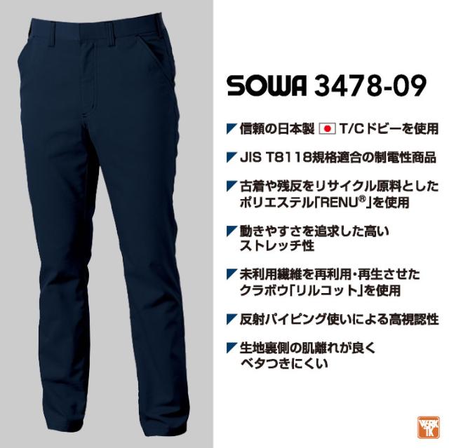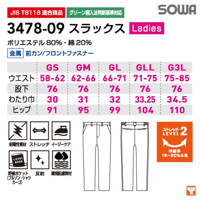SOWA レディース スラックス 春夏 ストレッチ 制電 JIS T8118適合品 作業ズボン パンツ 作業着 作業服 ユニフォーム 企業 制服 法人向け SDGs 女性用 S M L LL 3L 桑和 sw-3478-09-ladys