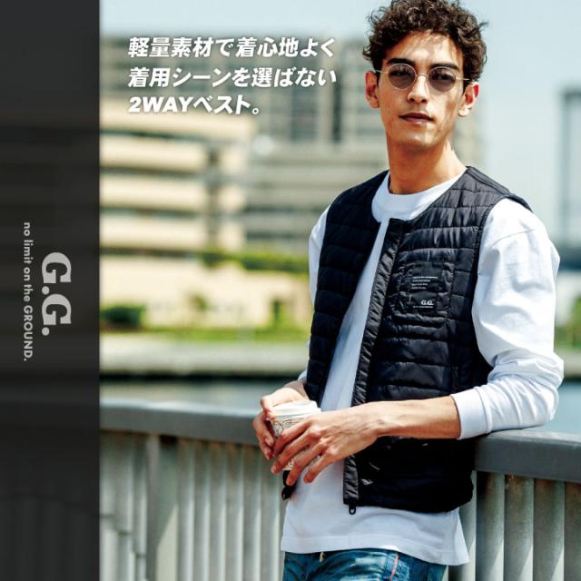 着用シーンを選ばない2WAYベスト。両脇ファスナーポケットで収納力も抜群。