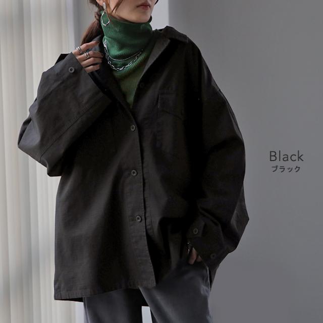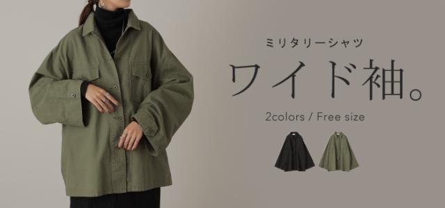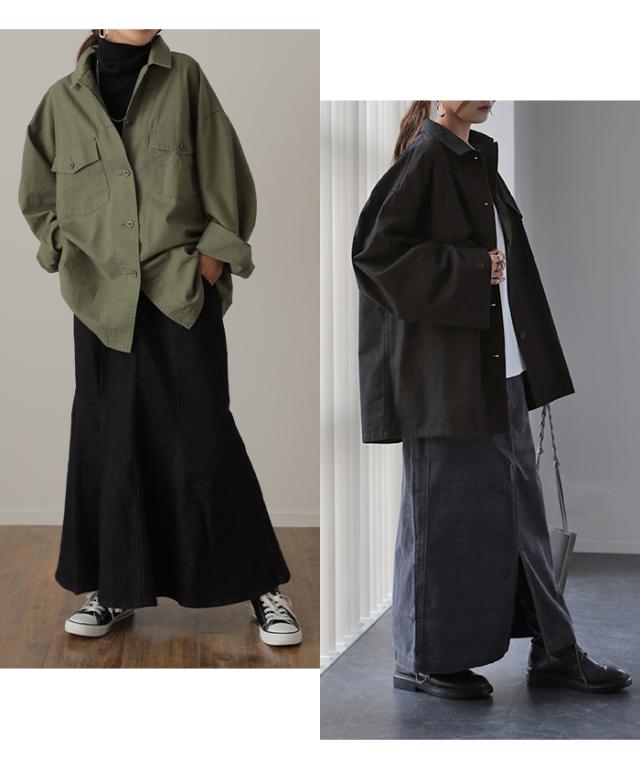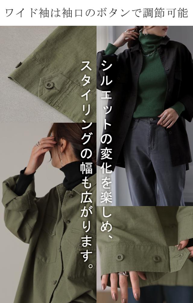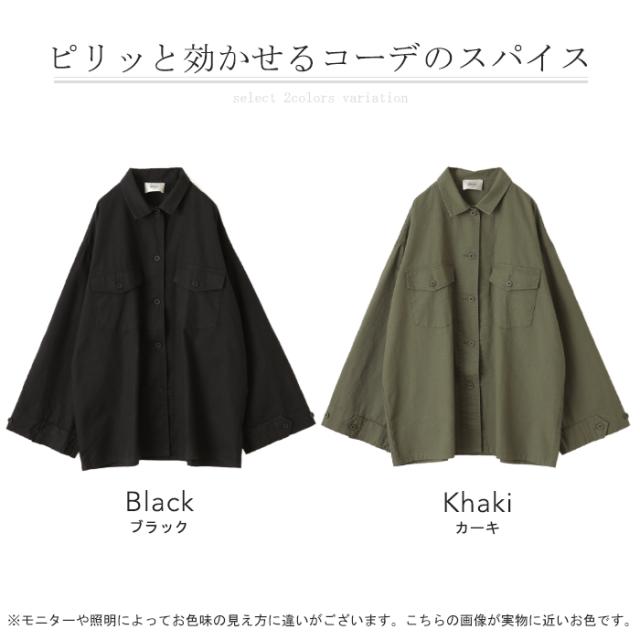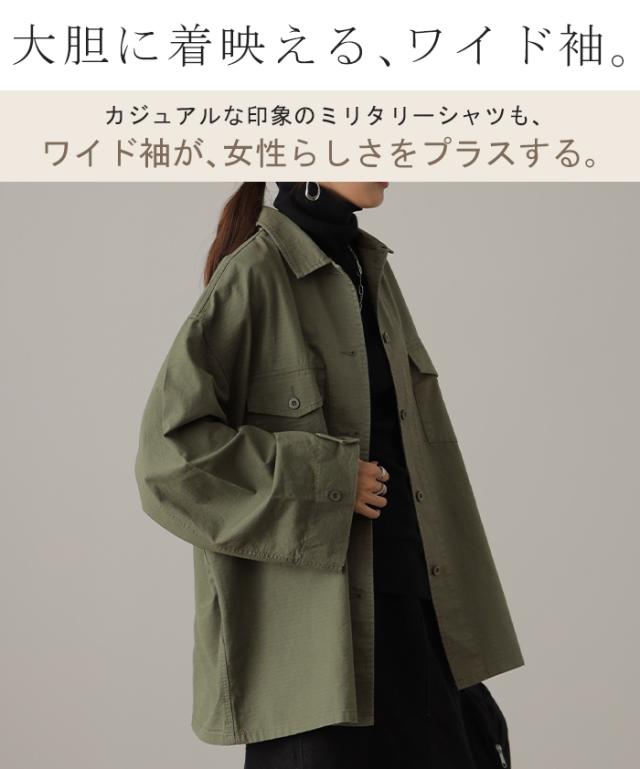 甘辛 『 ワイド袖 。』 シャツ ミリタリー トップス レディース ミリタリーシャツ アウター コットン100 綿 羽織 長袖 厚手 ロングシャツ チュニック ロング ビッグサイズ ライトアウター CPOジャケット 大きいサイズ カーキ 緑 黒 冬 秋 HUG.U 秋新作