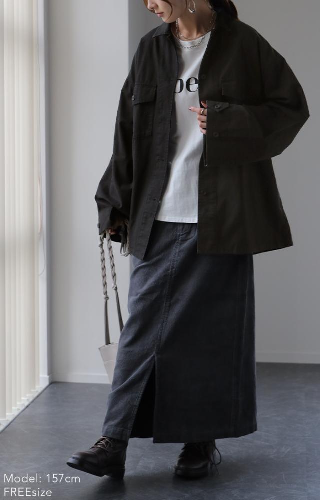 前開きでレイヤードしたり、女性らしいボトムスと合わせたミックスコーデがオススメ◎
