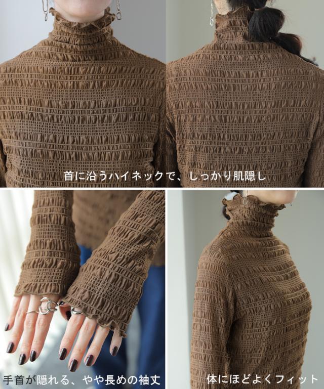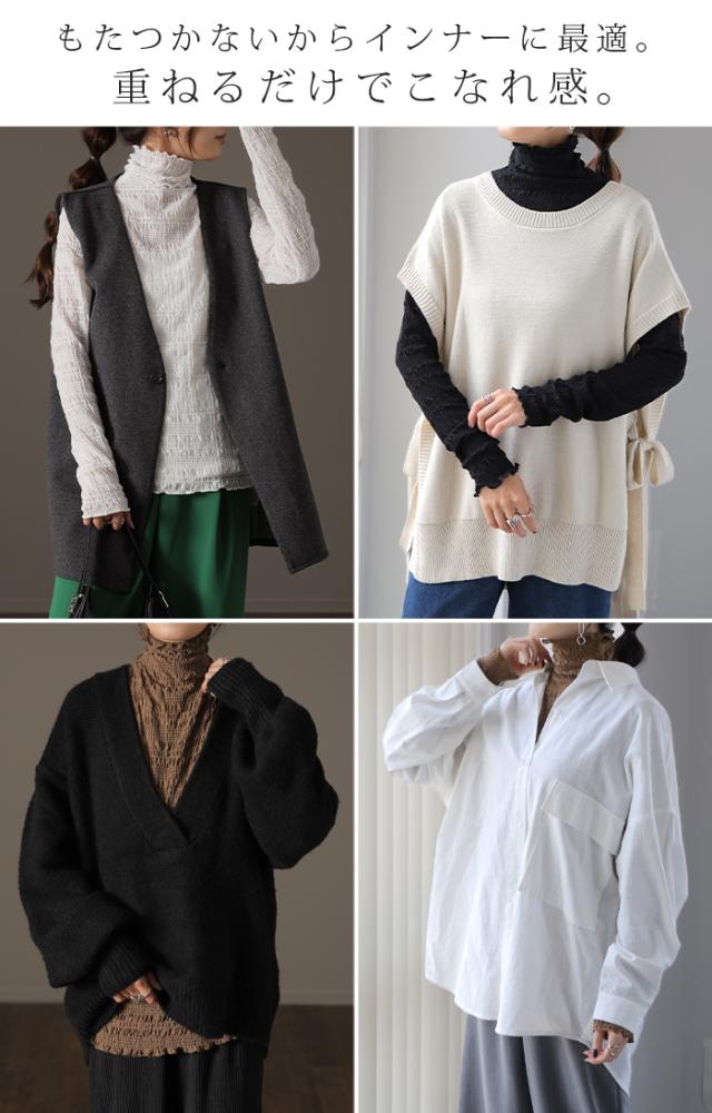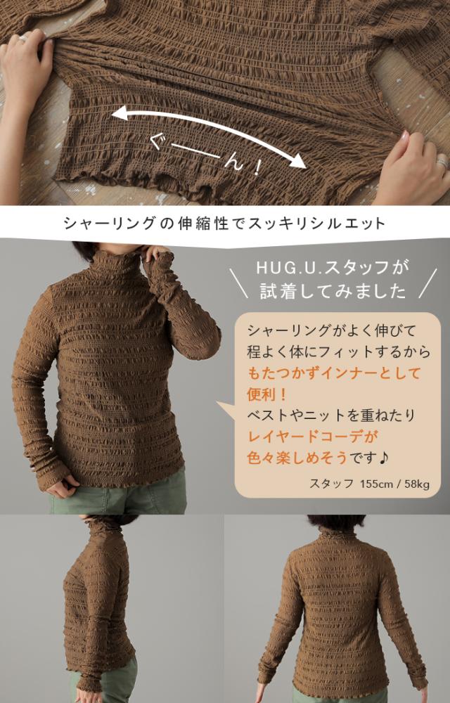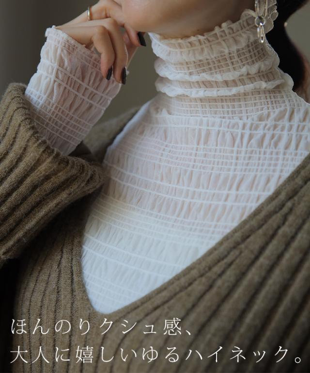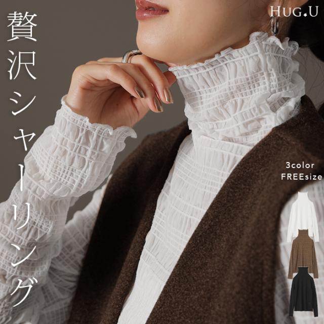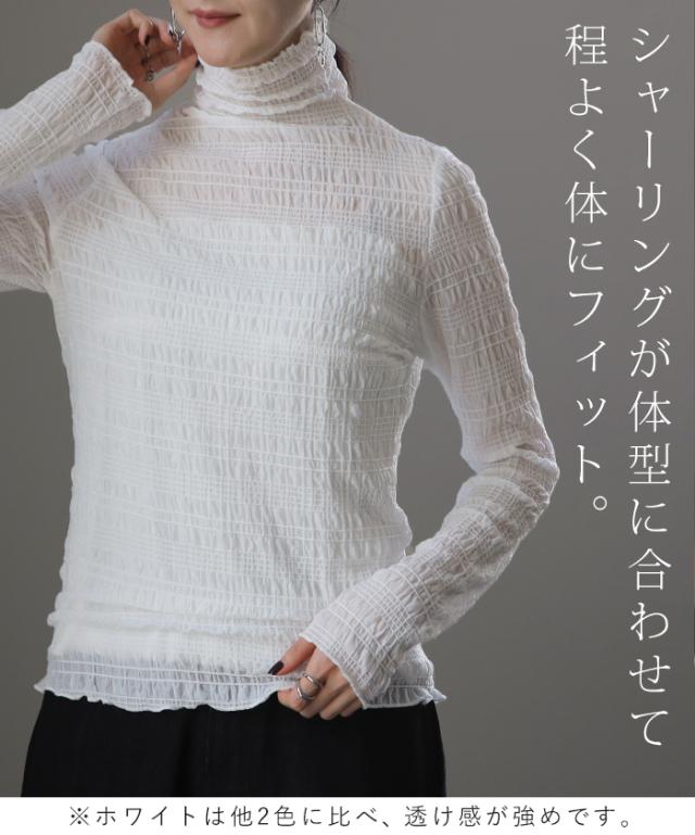 窮屈感なし「 くしゅっと立体感。」シアーインナー レイヤード トップス レディース シャーリング 肌隠し 無地 立体 シアー インナー タートル メロウ 長袖 重ね着 タートル きれいめ 体型カバー タートルネック 黒 白 冬 秋 HUG.U 秋新作