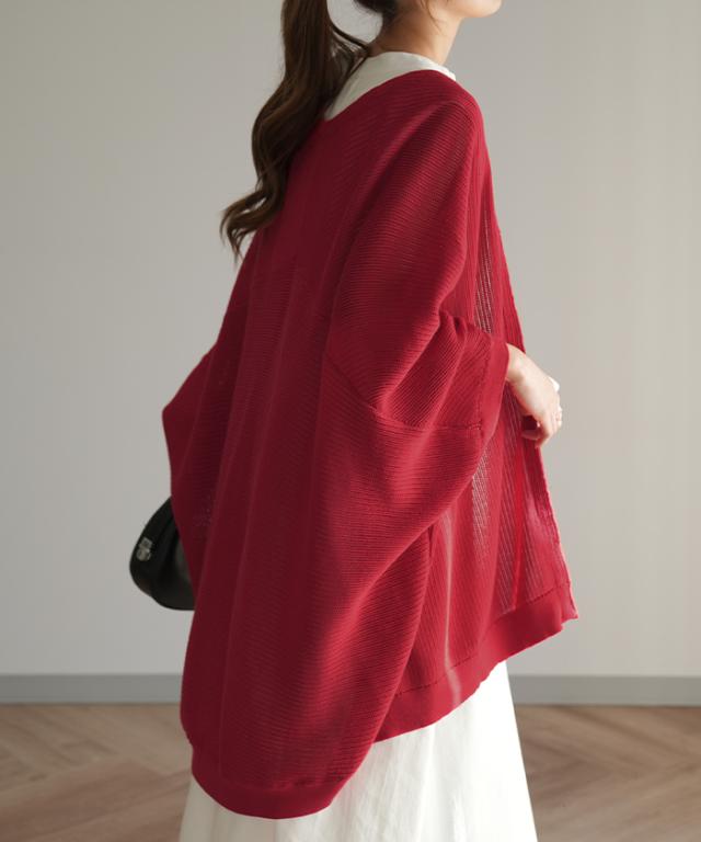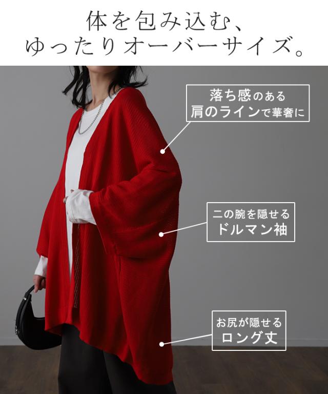 ゆったり隠す 『 モモンガカーデ 』 透かし編み 一部12月下旬入荷 メッシュ チュニック ニット サマーニット レディース カーディガン トップス ロング ロングカーデ 体型カバー お尻が隠れる 薄手 ビッグ プラスサイズ ドルマン 黒 白 赤 大きいサイズ 冬 秋 HUG.U 秋新作