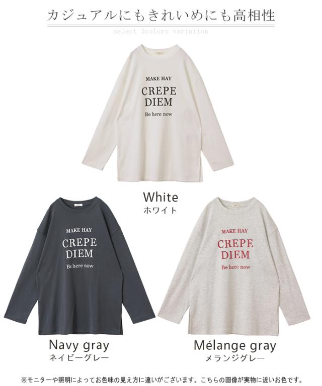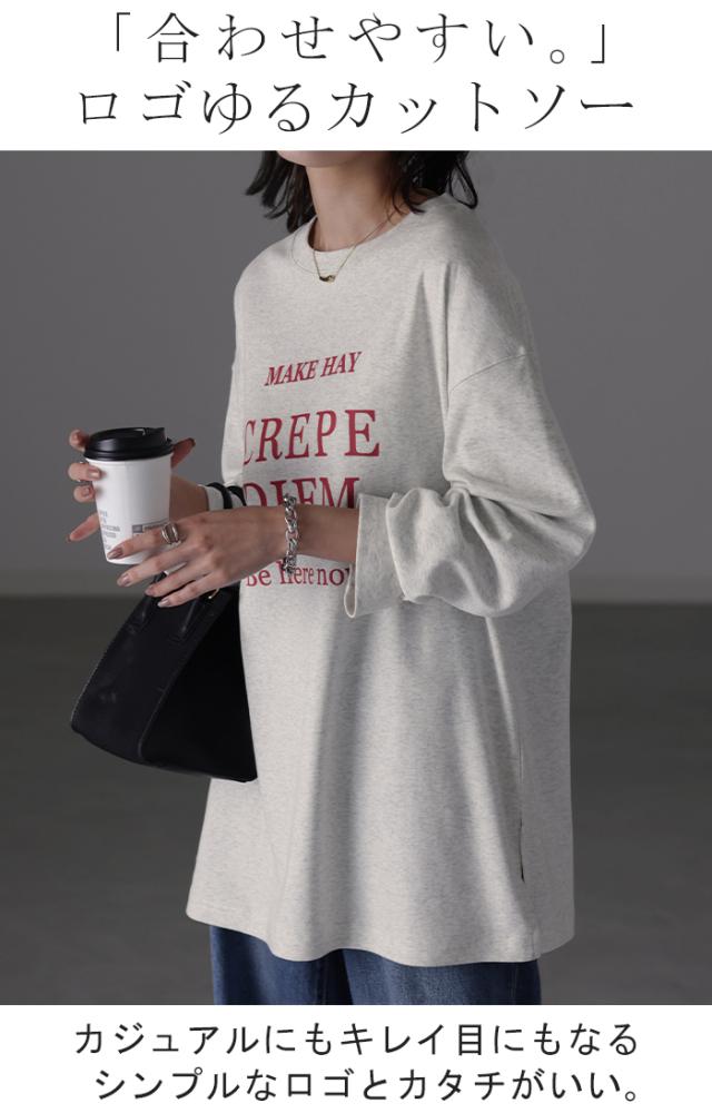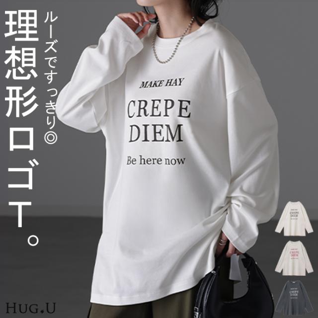 ロゴT 「すっきりルーズ」 レディース ロゴ ロンT カットソー ティーシャツ 無地 長袖 Tシャツ ロング チュニック ビッグ プリント ドルマン 大きいサイズ きれいめ ゆる トップス ドルマン Uネック 長い 体型カバー 大人 お洒落 白 秋 夏 HUG.U 秋新作