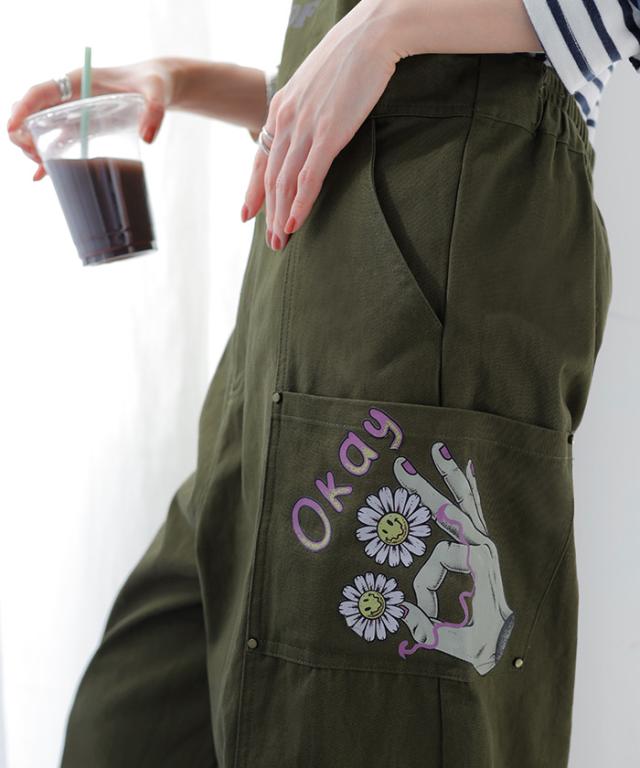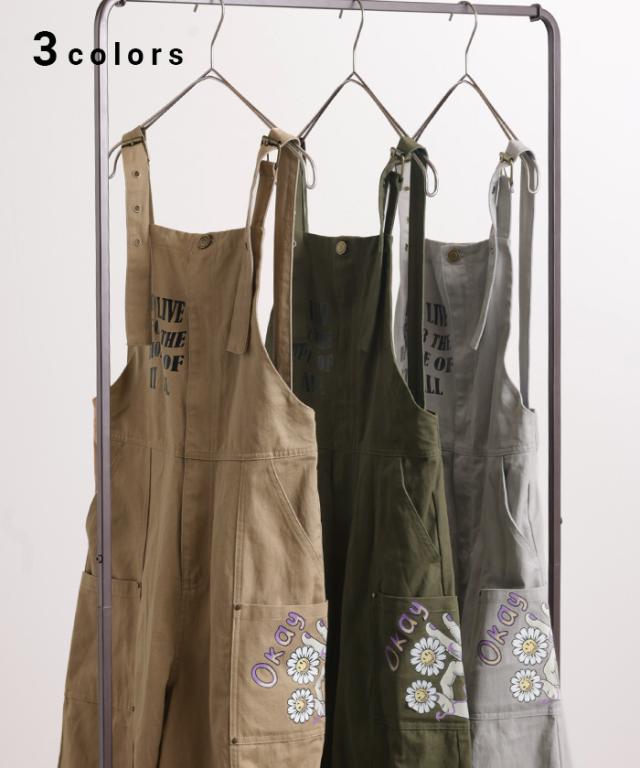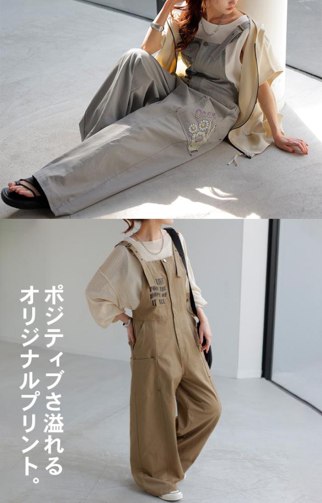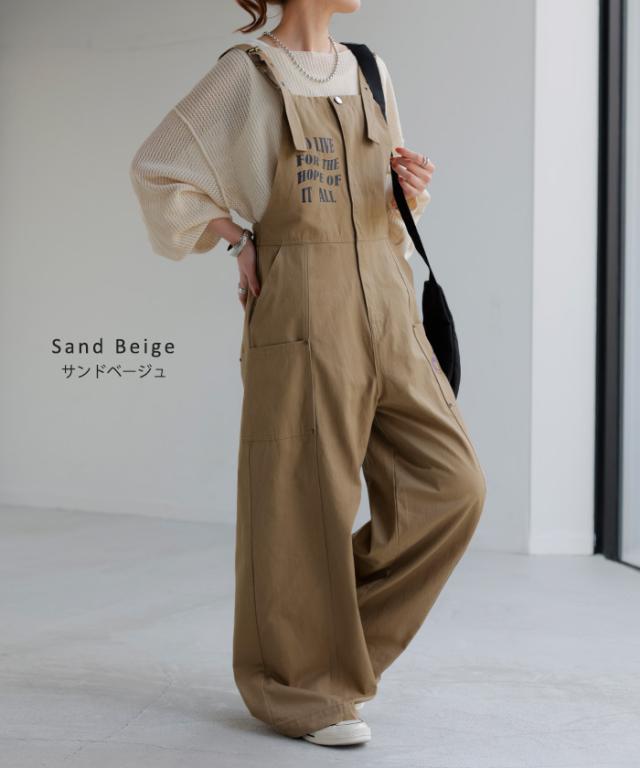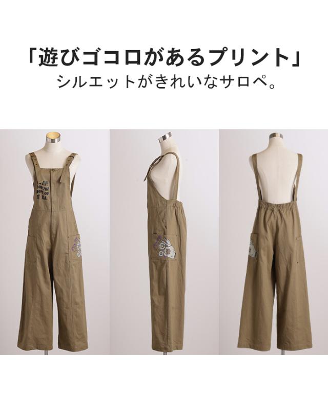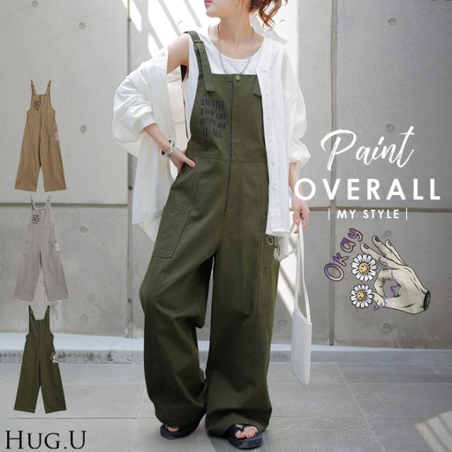 【冬SALE】 サロペット 綿100% プリント レディース オールインワン ロゴ ワイド ワイドパンツ ハイウエスト ウエストゴム サロペ つなぎ オーバーオール ボトムス ロング コットン サスペンダー 調節可能 ゆったり カジュアル ベージュ カーキ 春 夏 HUG.U