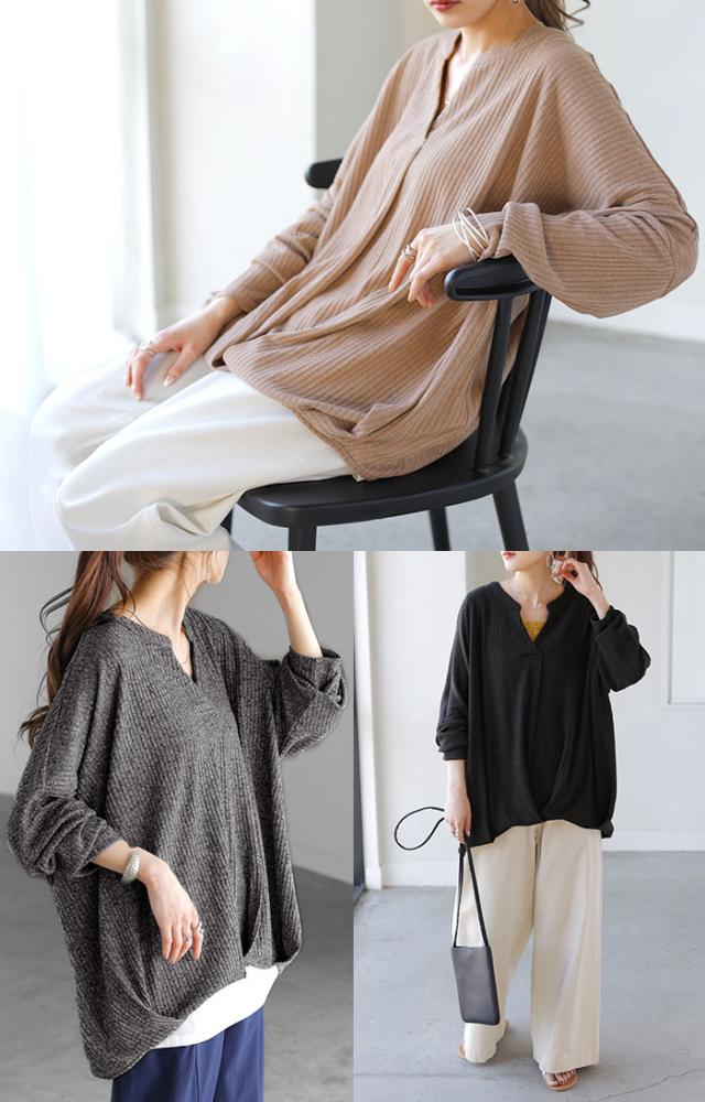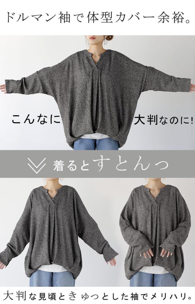 ドルマンスリーブで絶妙に体型カバーしながらも、お洒落にきこなせます。