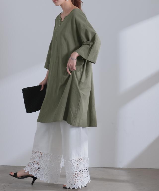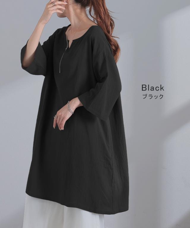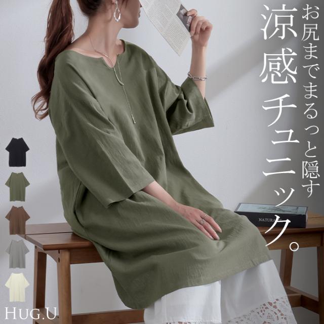 ブラウス チュニック シャツ レディース トップス 4月下旬入荷 キーネック スキッパー ロング ロングシャツ シャツワンピース 長袖 無地 綿100% きれいめ ゆったり 7分袖 大きいサイズ 体型カバー オーバーサイズ お尻が隠れる カーキ 白 黒 春 夏 HUG.U