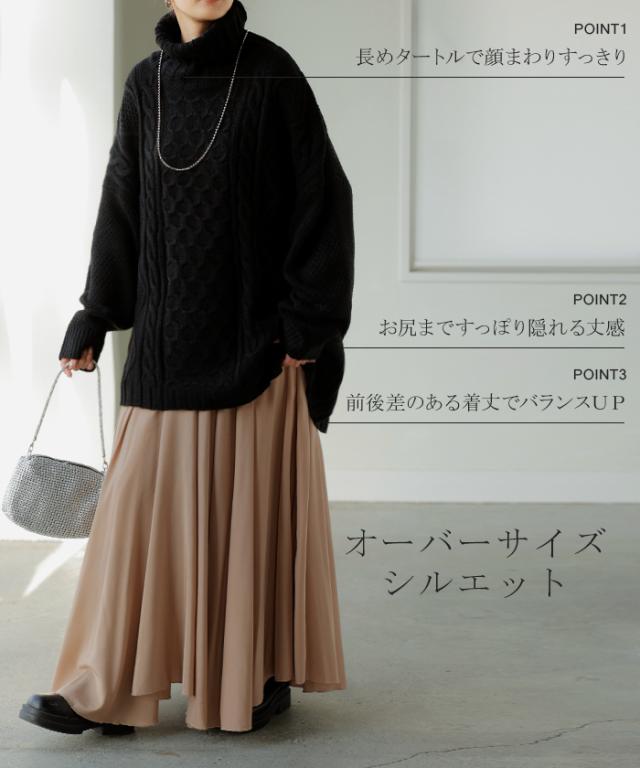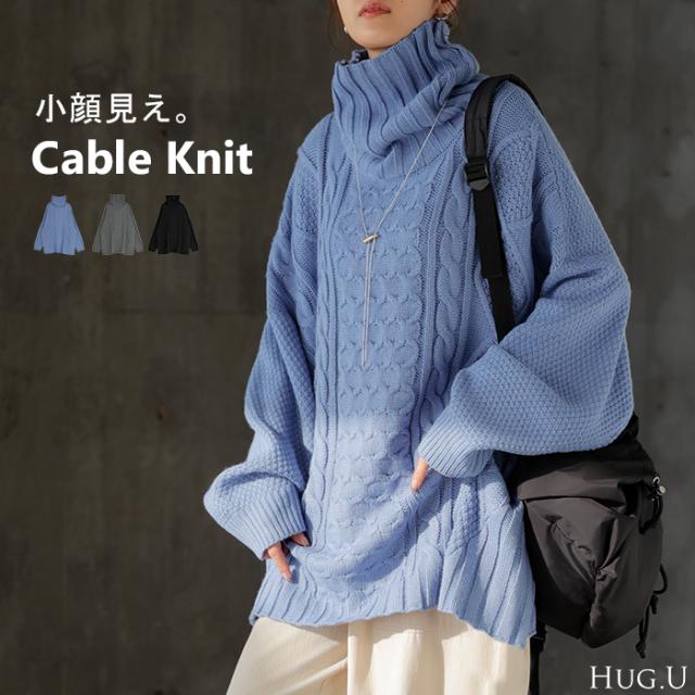 2025AW新作 ニット タートルネック ケーブル ロング レディース トップス セーター オーバー プルオーバー ケーブル編み ハイネック 長袖 長い ボリュームスリーブ リブ チュニック 体型カバー 大きいサイズ お尻が隠れる カジュアル 黒 グレー 秋 冬 HUG.U