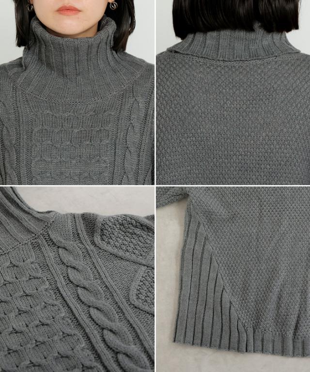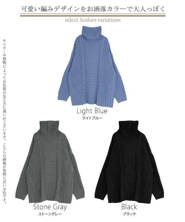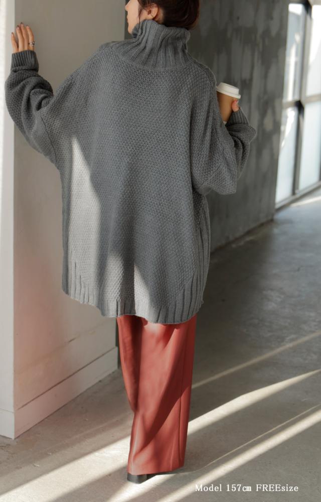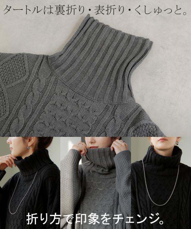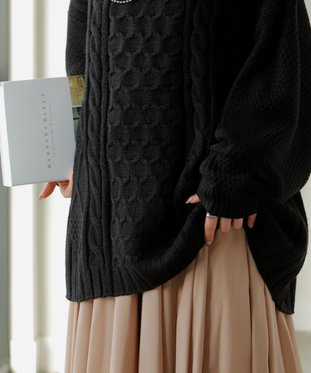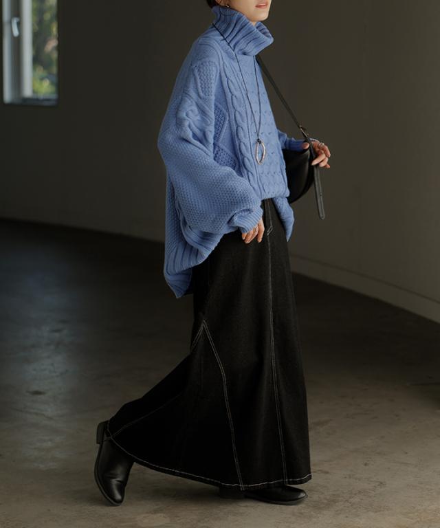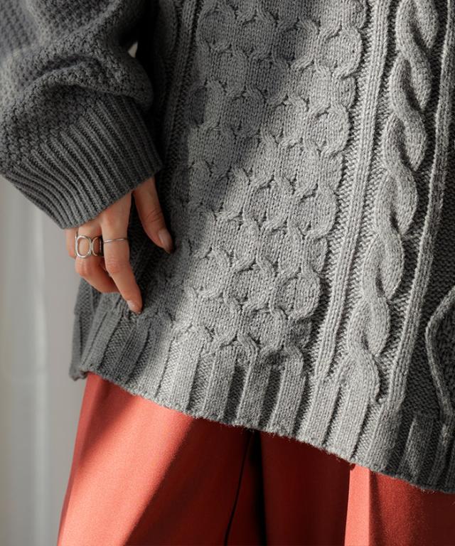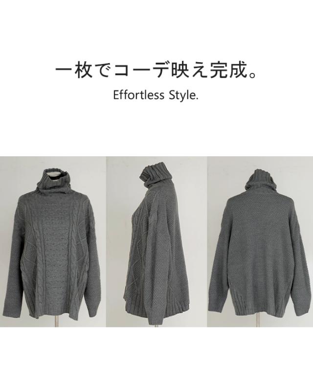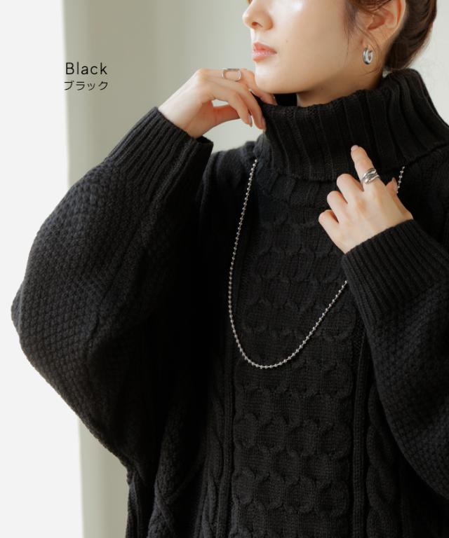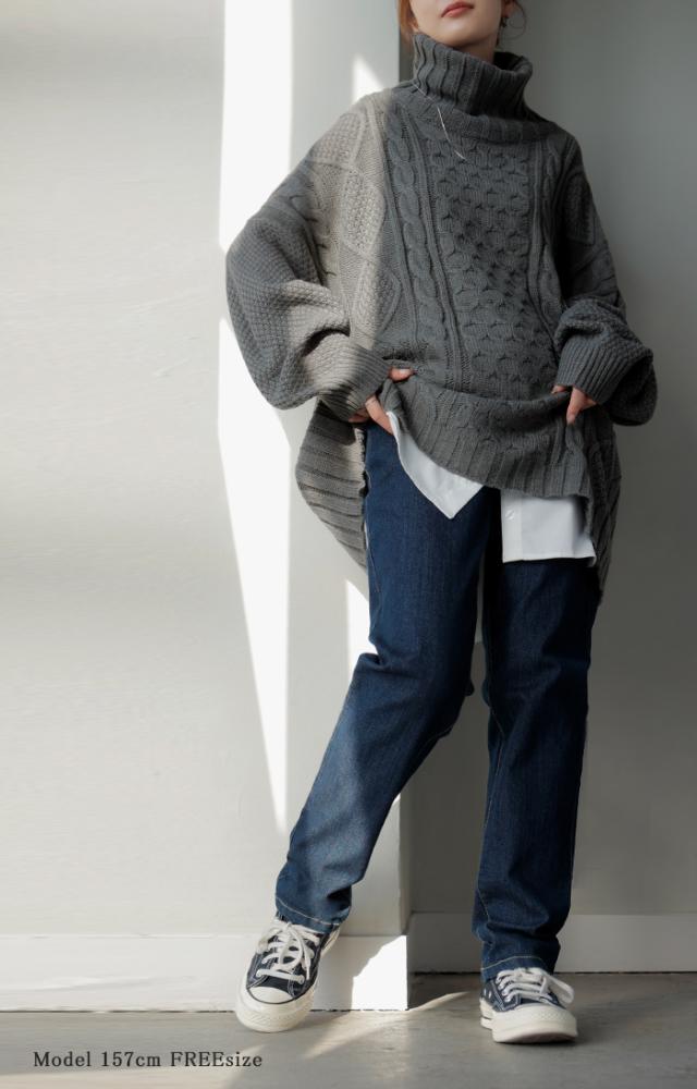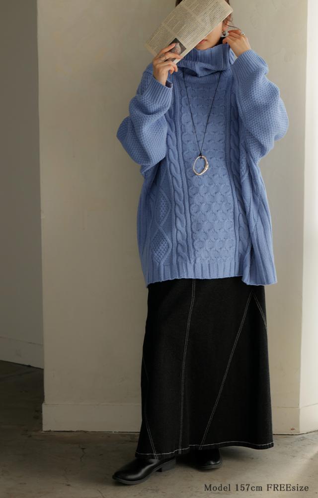 ざっくりと着られるオーバーサイズのケーブル編みタートルニットです。