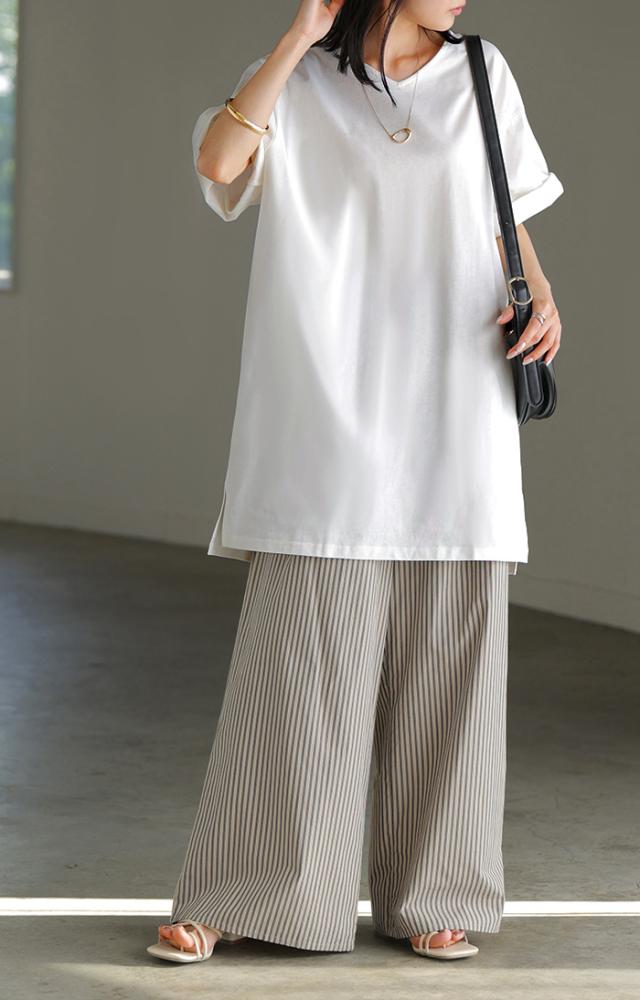 ゆったりシルエットで体のラインをひろいにくく自然と体型カバー。