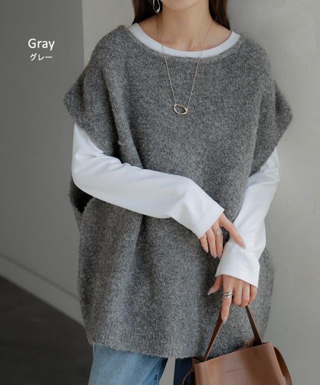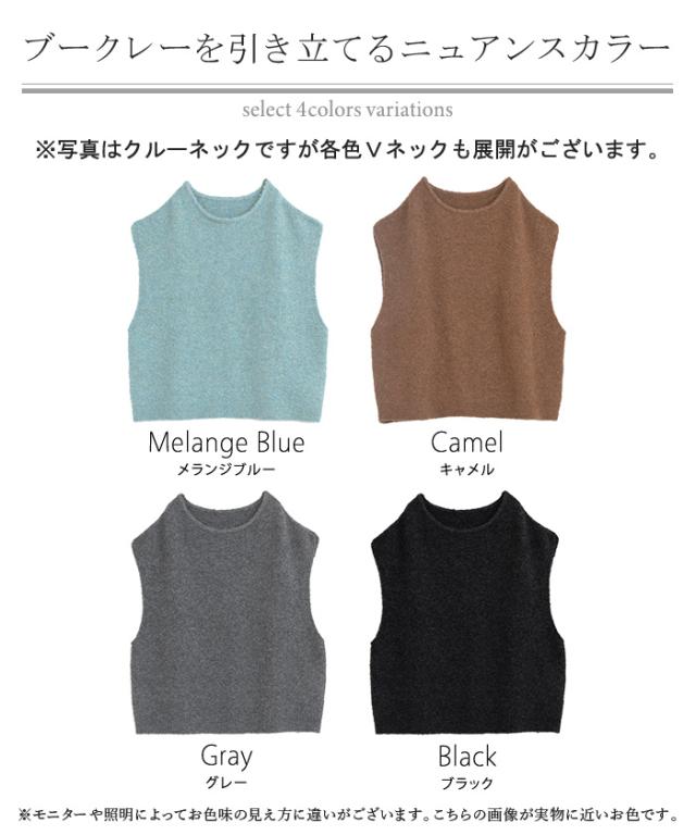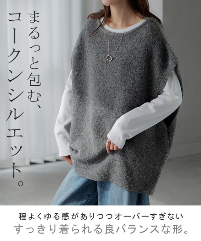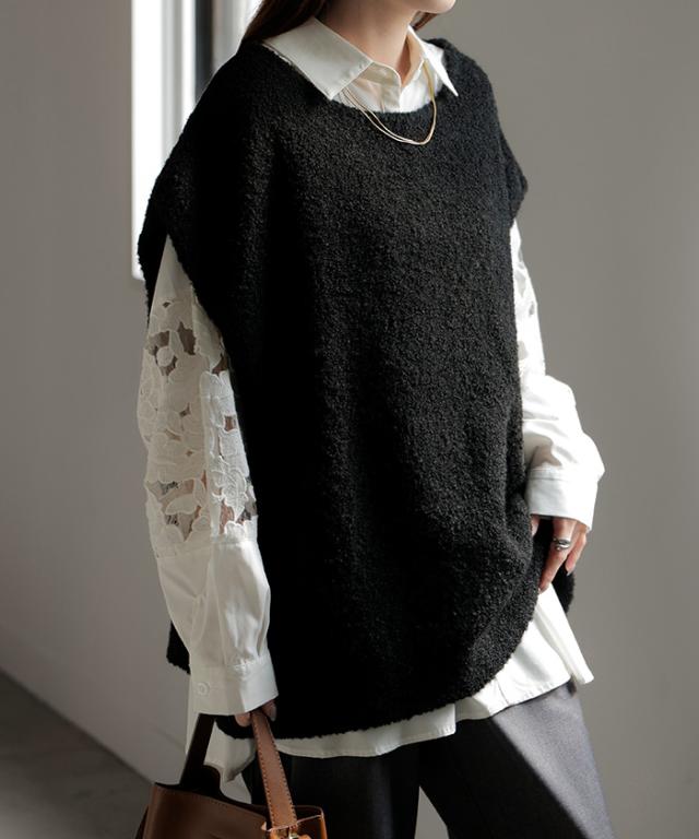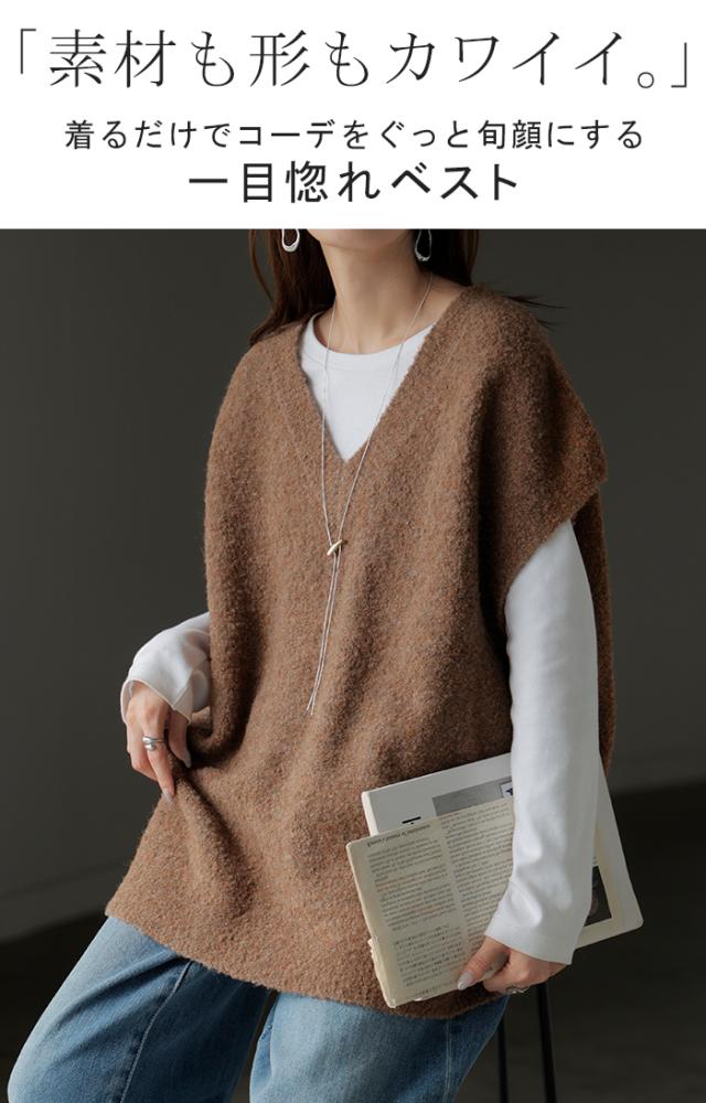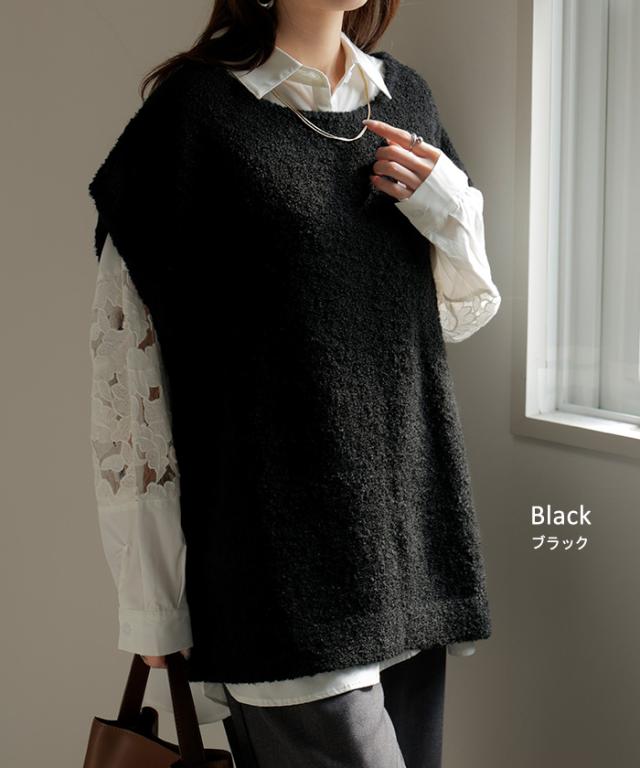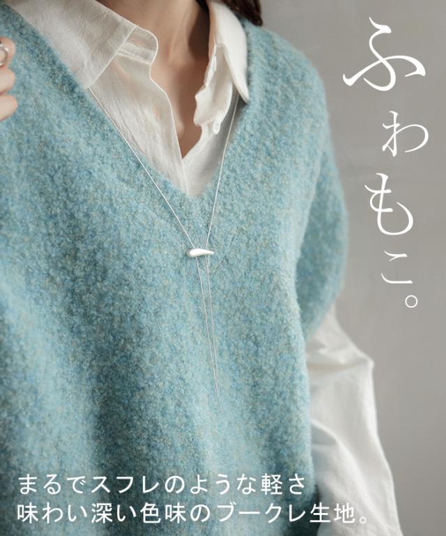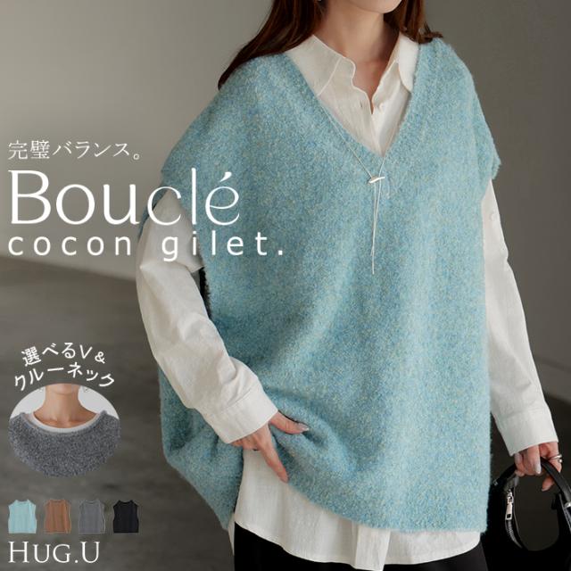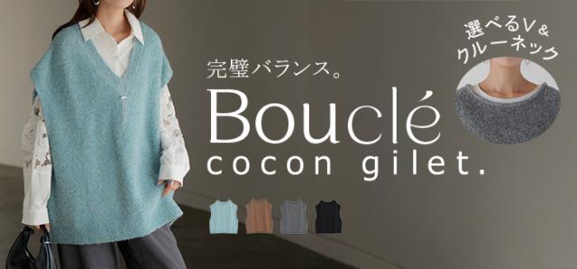 プラスワンで幅広いレイヤードスタイルが楽しめるブークレーニットベスト。