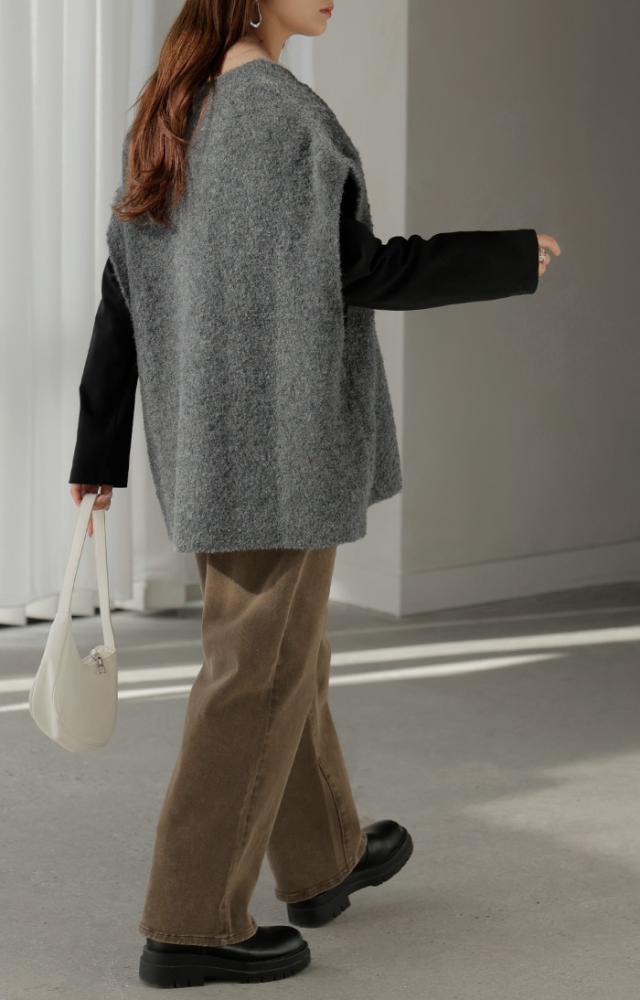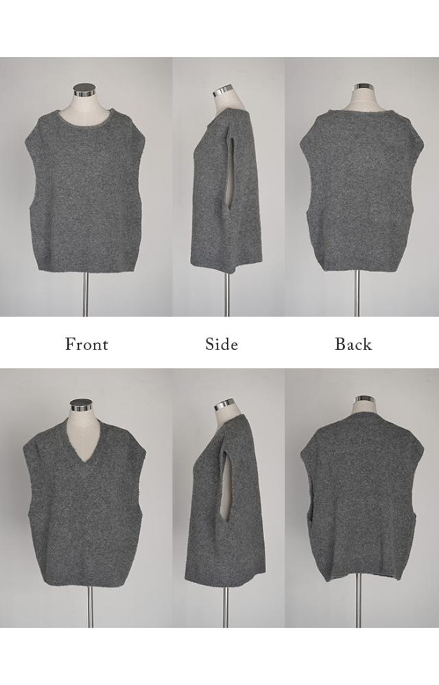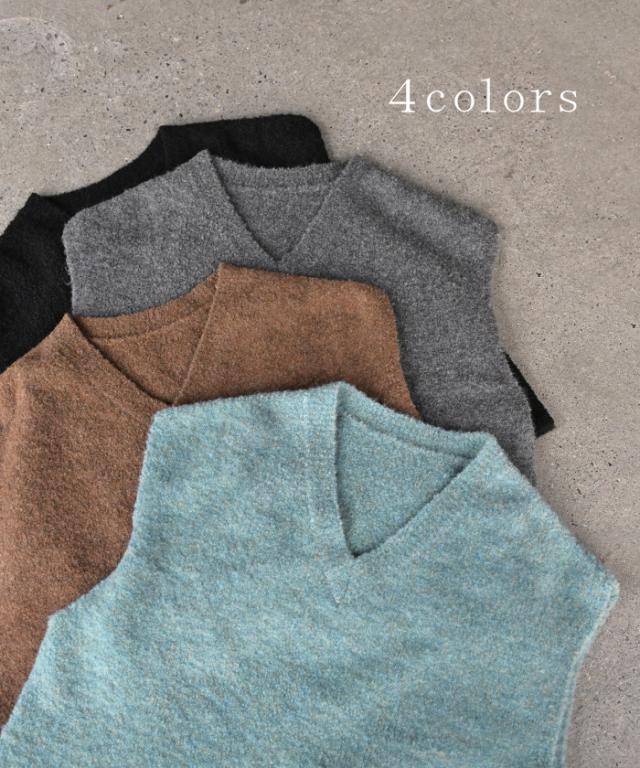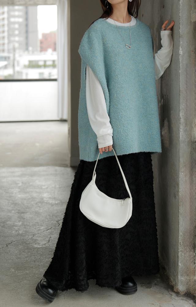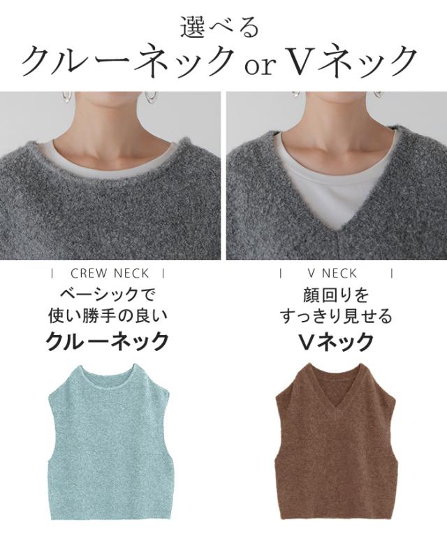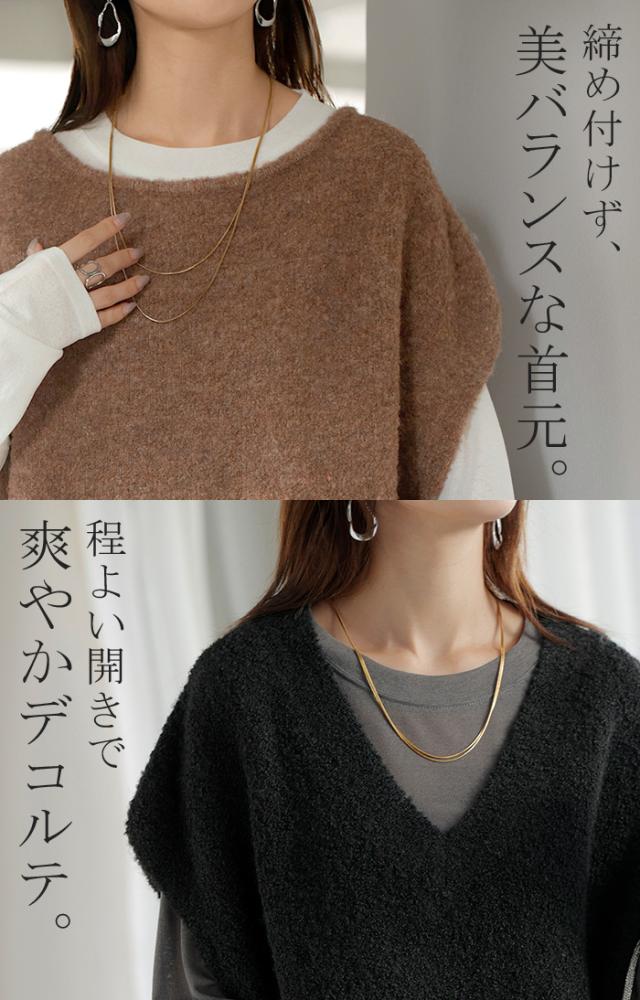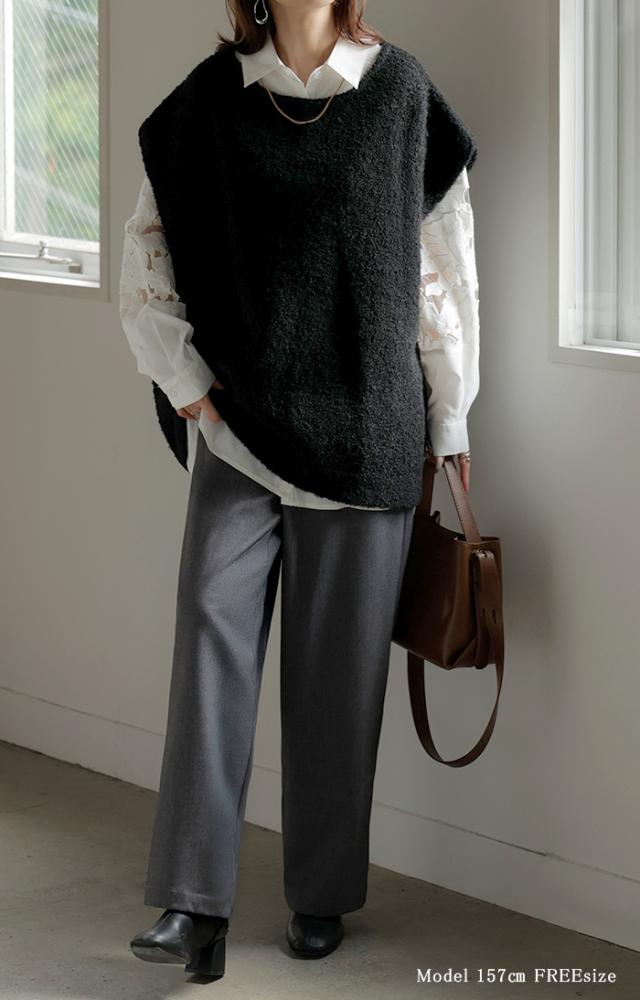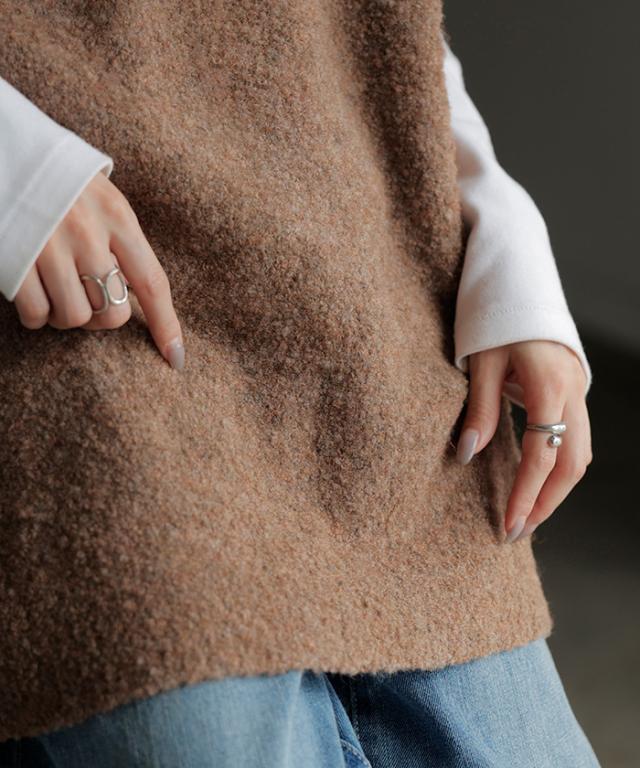 プラスワンで幅広いレイヤードスタイルが楽しめるブークレーニットベスト。