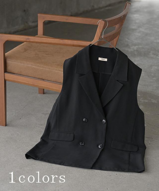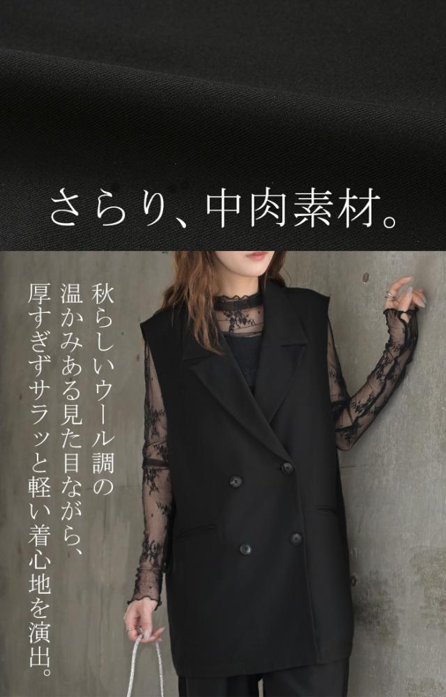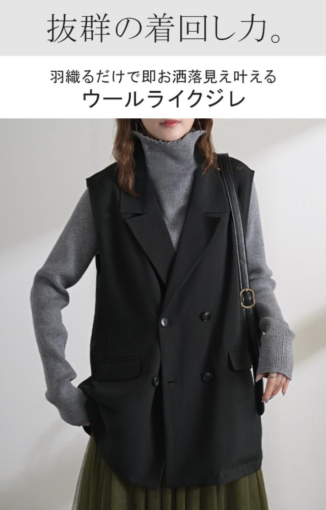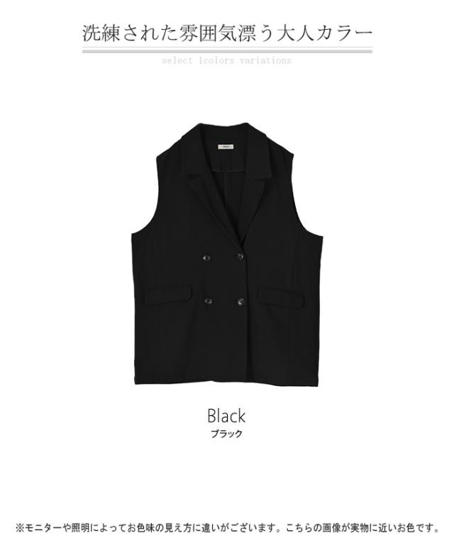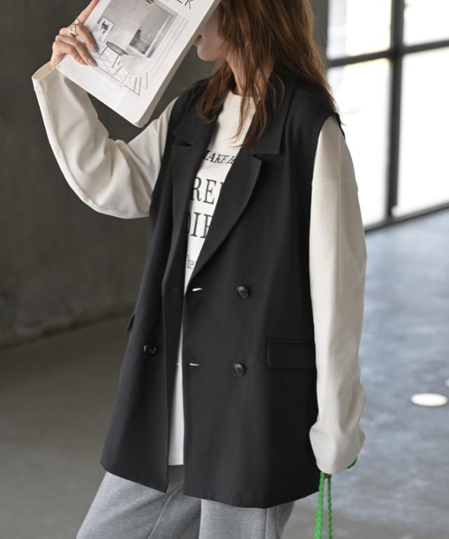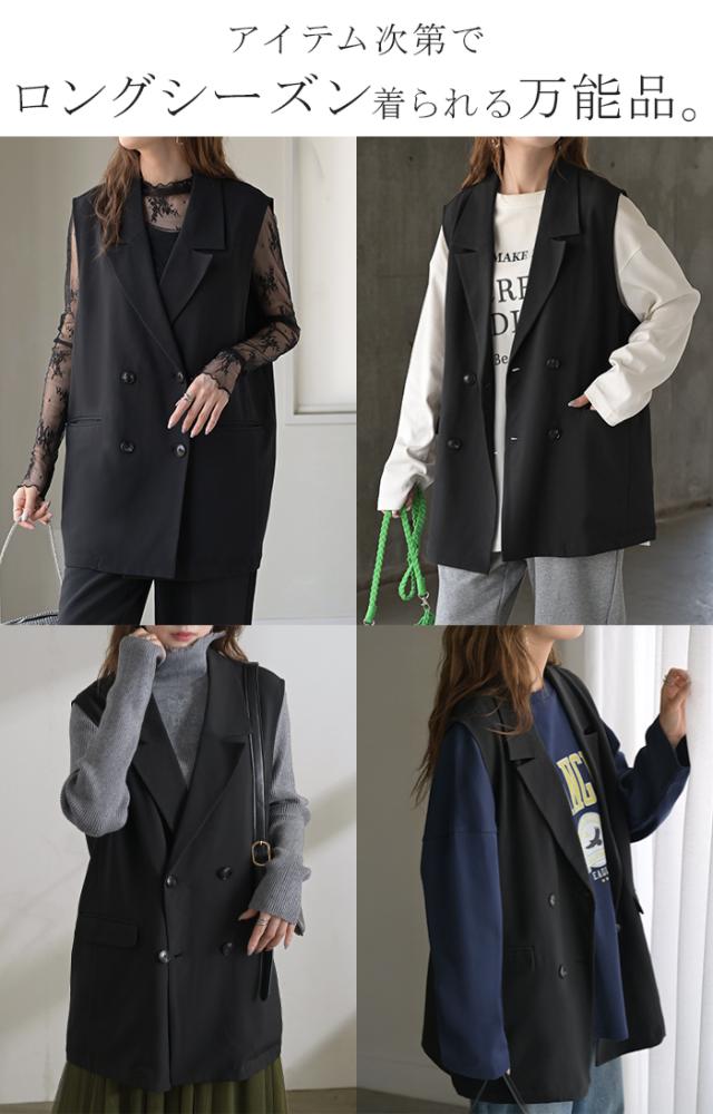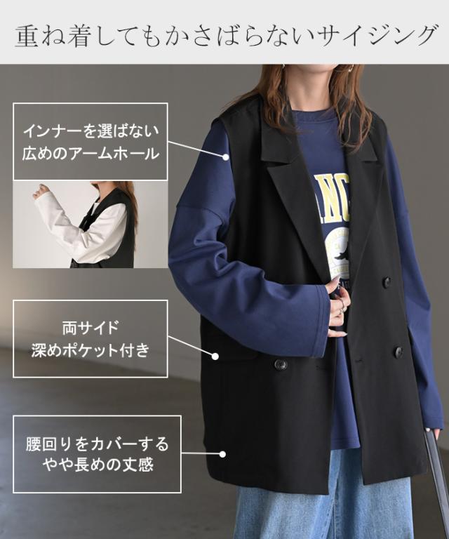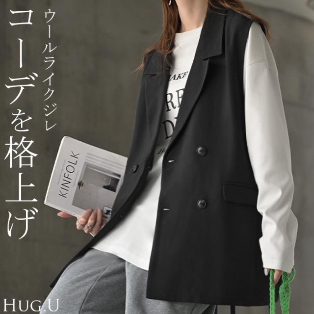 2025AW新作 ジレ ウール ライク イージーケア レディース トップス アウター ベスト ジャケット テーラード 襟 ノースリーブ 羽織 レイヤード ダブルボタン 体型カバー 無地 前開き ゆったり お尻が隠れる 大きいサイズ 黒 ブラック 秋 冬 HUG.U