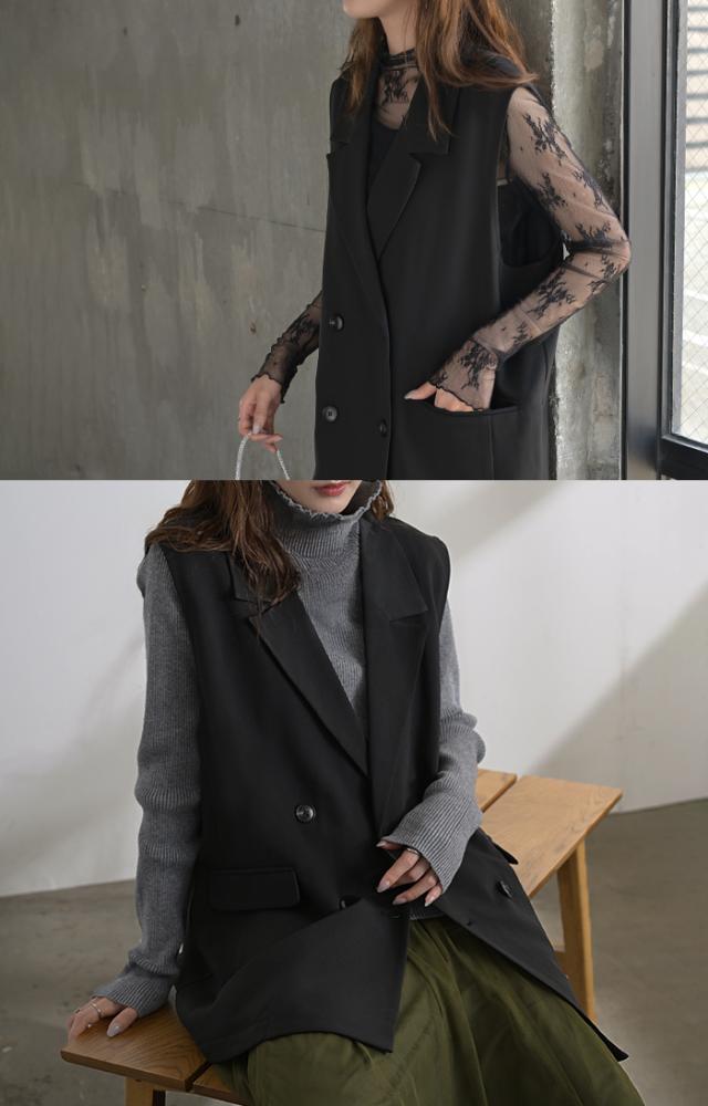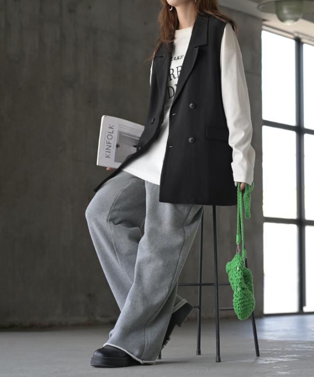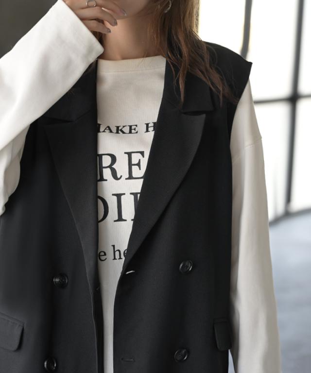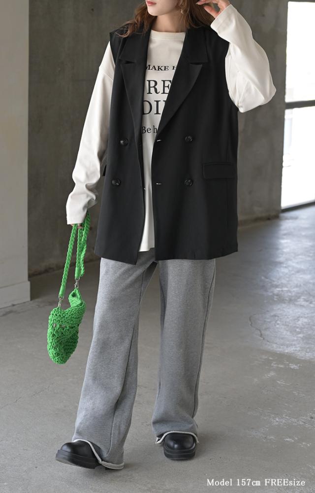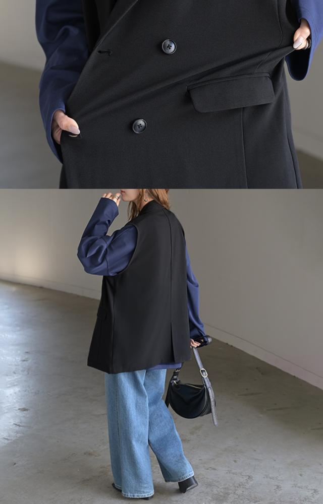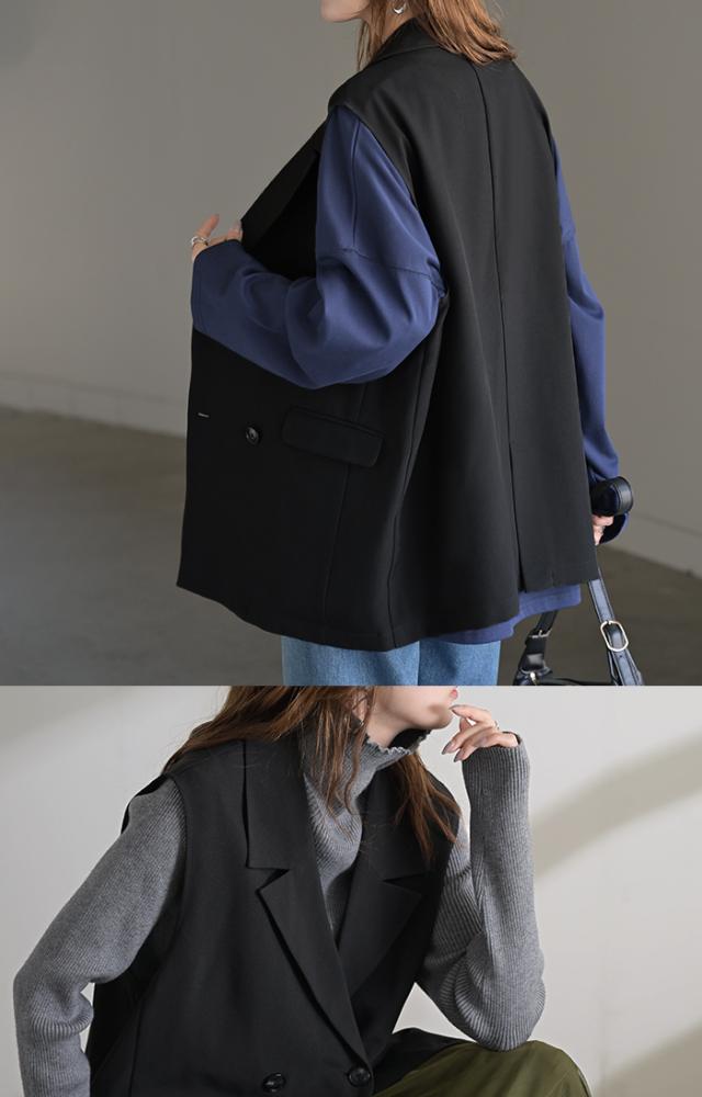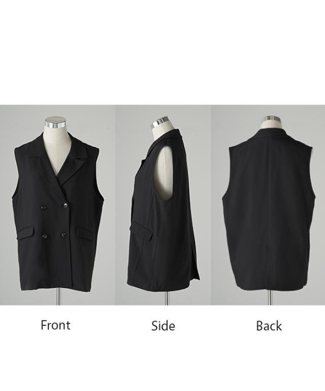2025AW新作 ジレ ウール ライク イージーケア レディース トップス アウター ベスト ジャケット テーラード 襟 ノースリーブ 羽織 レイヤード ダブルボタン 体型カバー 無地 前開き ゆったり お尻が隠れる 大きいサイズ 黒 ブラック 秋 冬 HUG.U