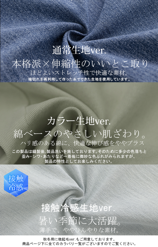 | 素材 | 通常:綿76% ポリエステル22% ポリウレタン2% 冷感:綿61% ナイロン37% ポリウレタン2% カラー:綿98% ポリウレタン2% |
