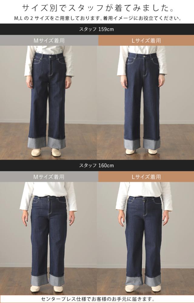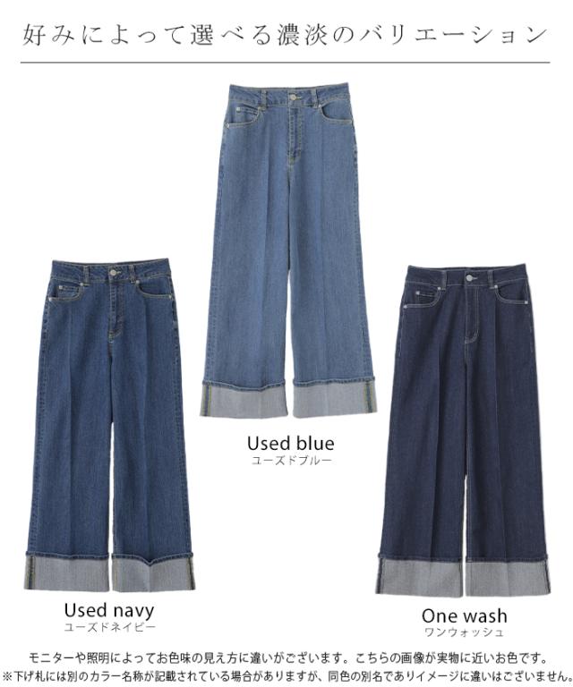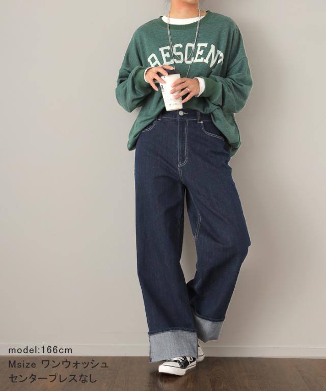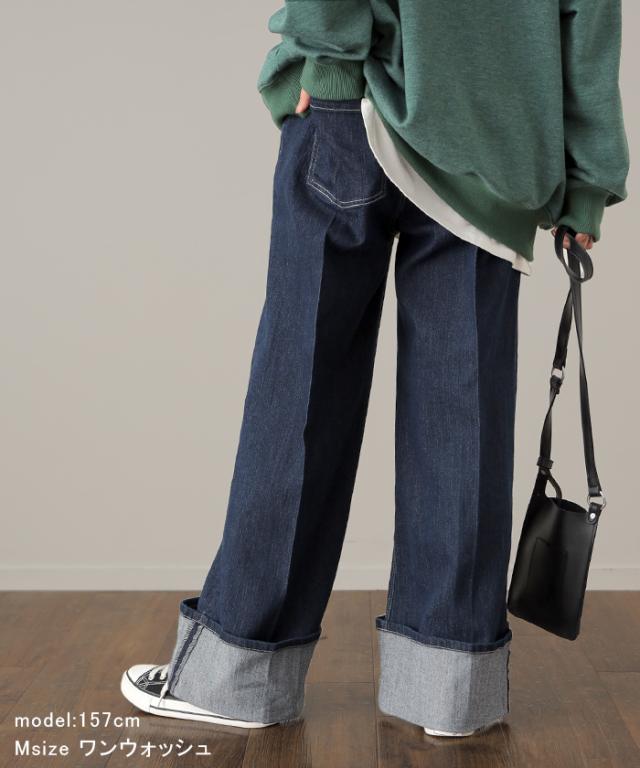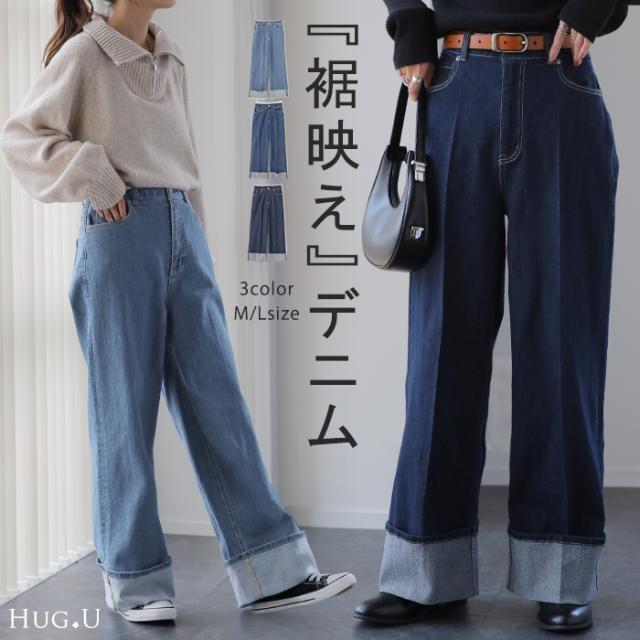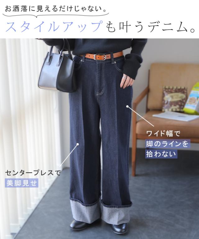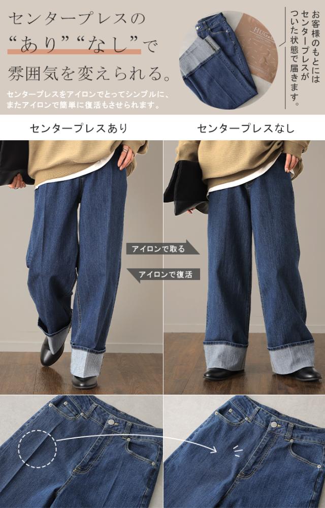 新 感 覚「 美脚 センタープレス 」 ロールアップ デニム パンツ デニムパンツ レディース ワイドパンツ ワイド 大きいサイズ ジーンズ ジーパン ボトム 体型カバー ボトムス ストレート ハイウエスト ズボン 伸びる ストレッチ 脚長 冬 秋 HUG.U 秋新作