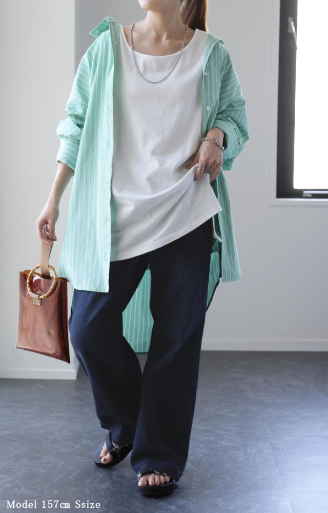ハイウエストで腰位置を高く見せつつ足のラインを拾いにくいシルエット。
