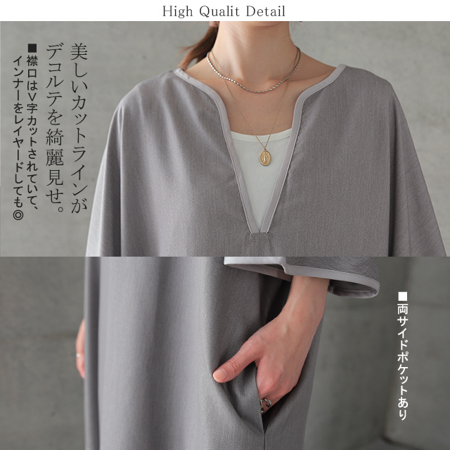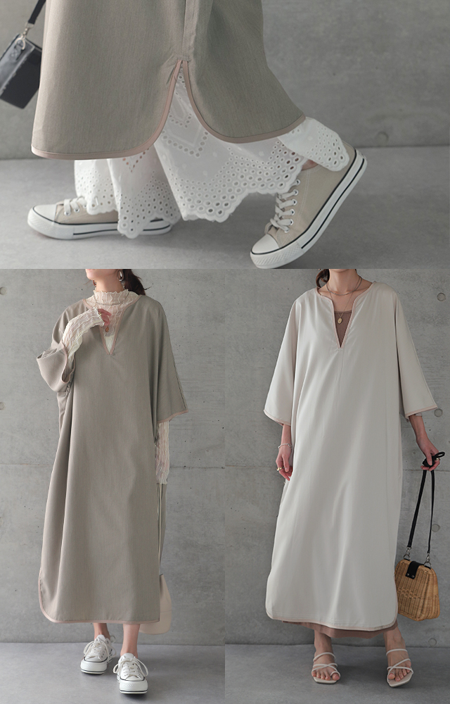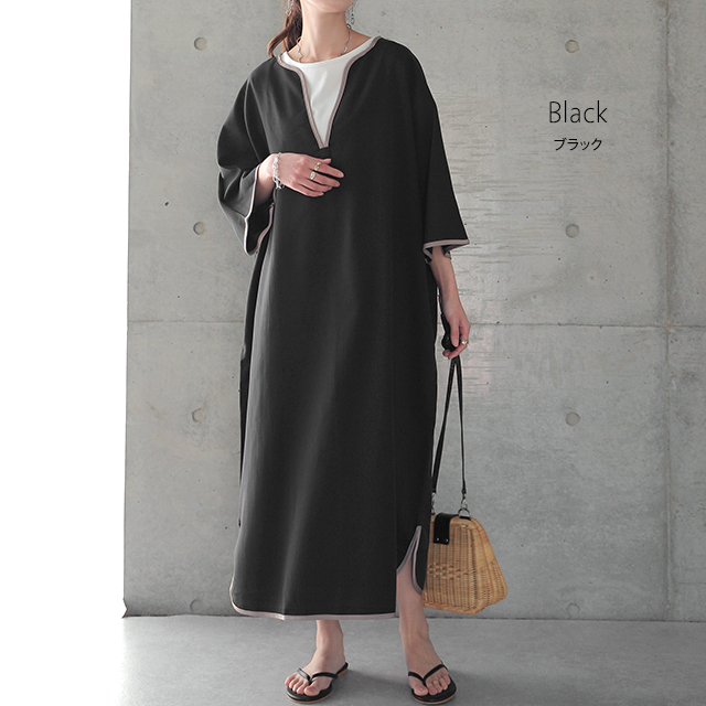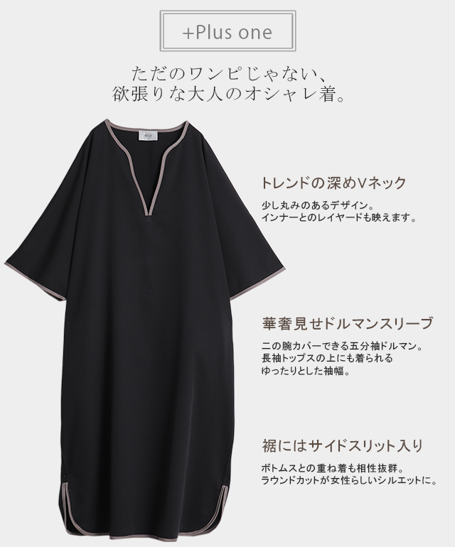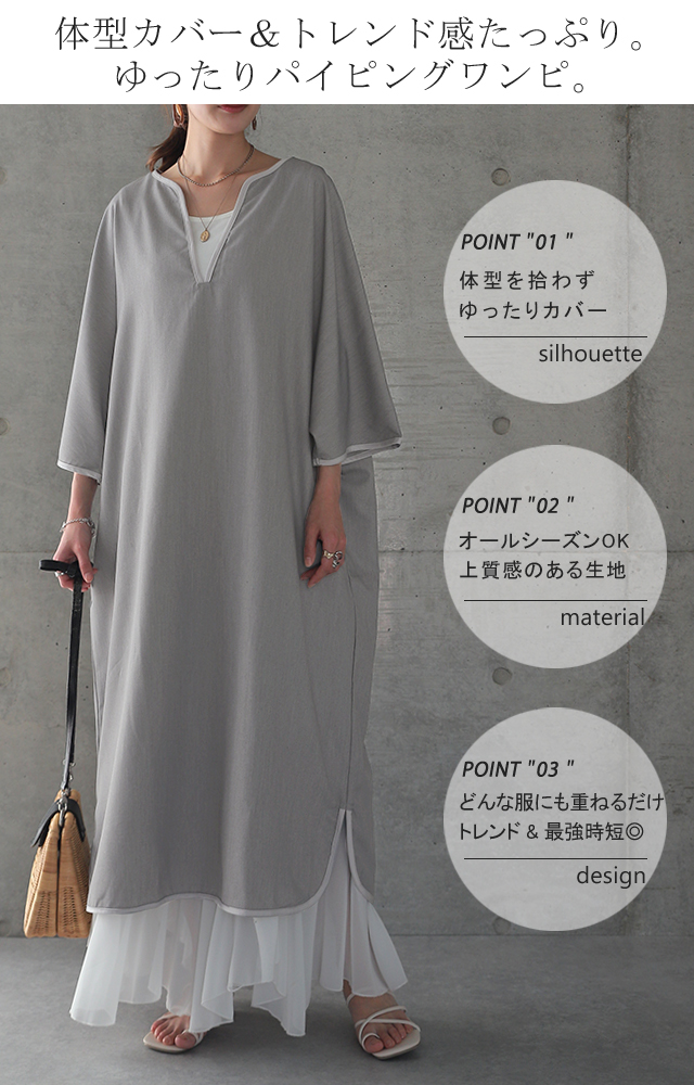 【冬SALE】 体型を包み隠す「パイピングワンピ」ワンピース レディース ドルマン ロング パイピング Vネック レイヤード ドロップショルダー スリット ゆったり 七分袖 無地 体型カバー 大きいサイズ 夏 秋 秋新作