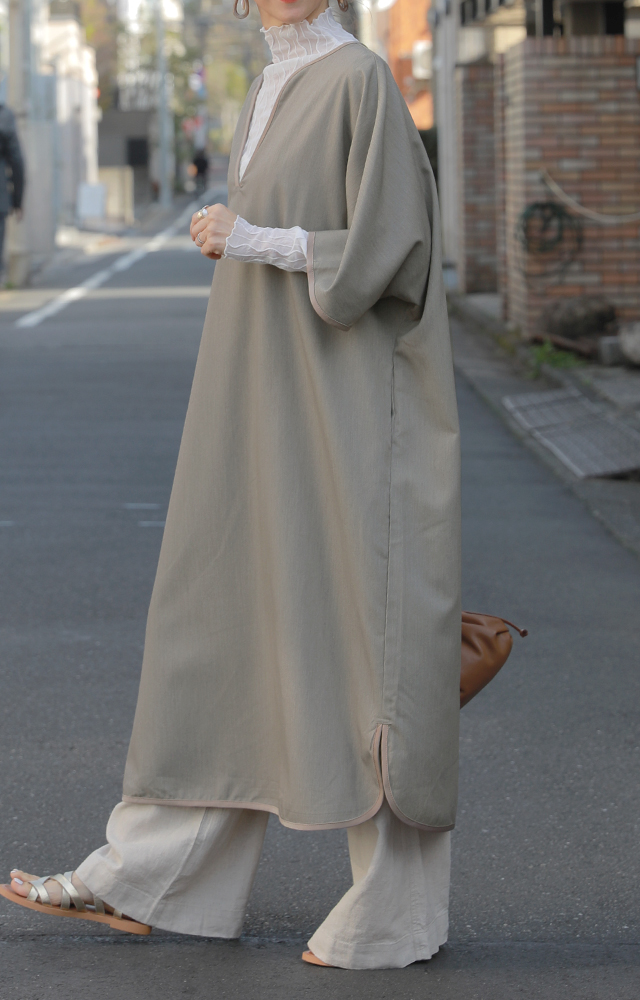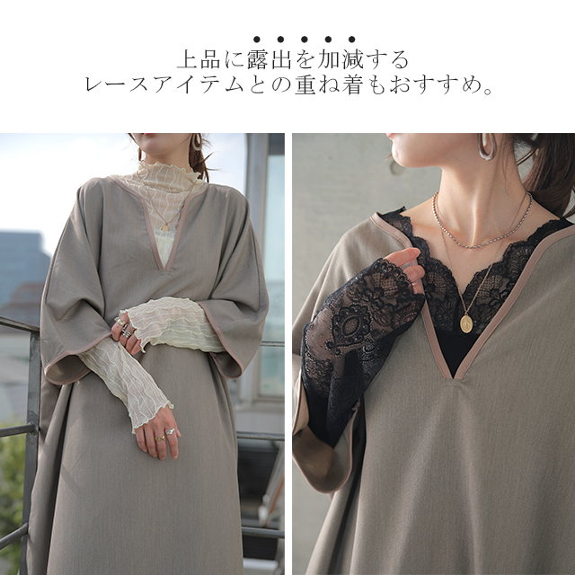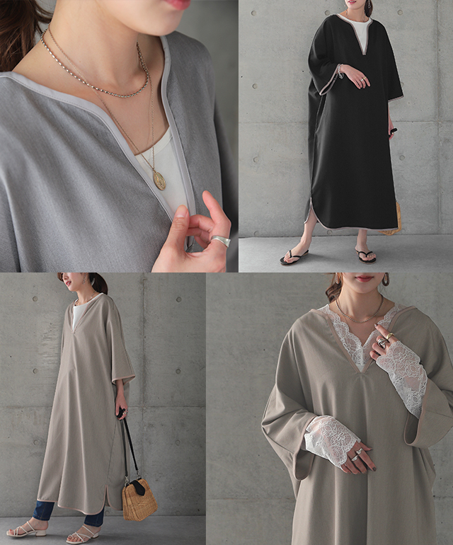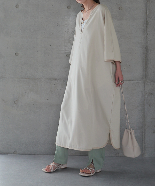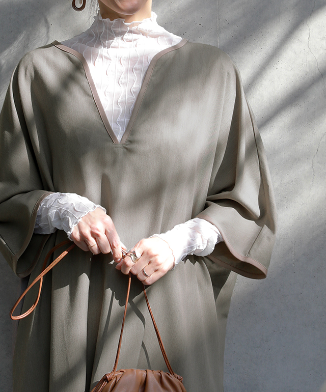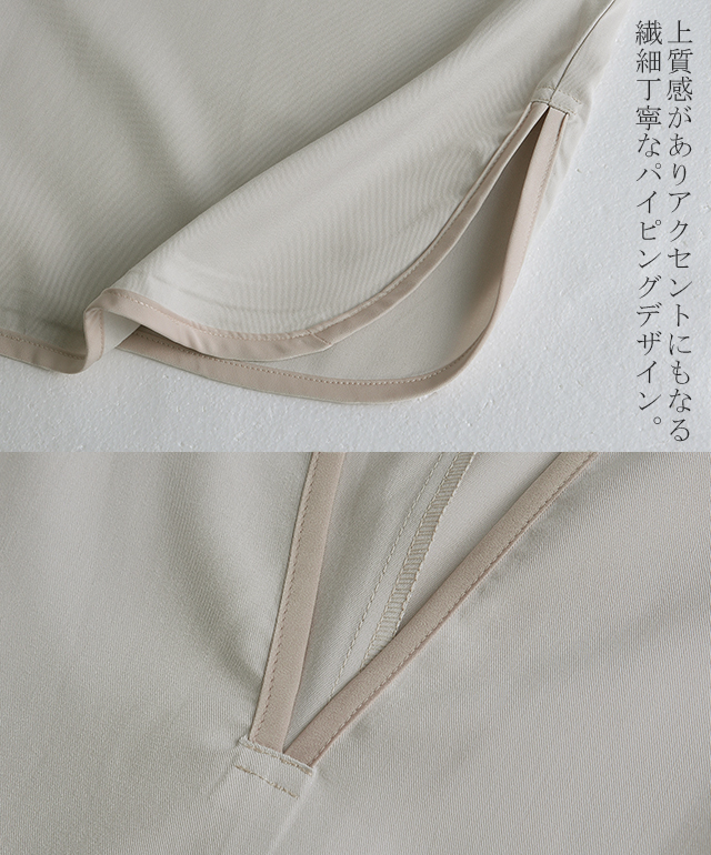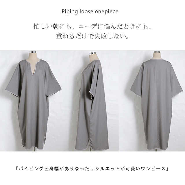 パイピングやキーネックデザインが印象的なワンピース。