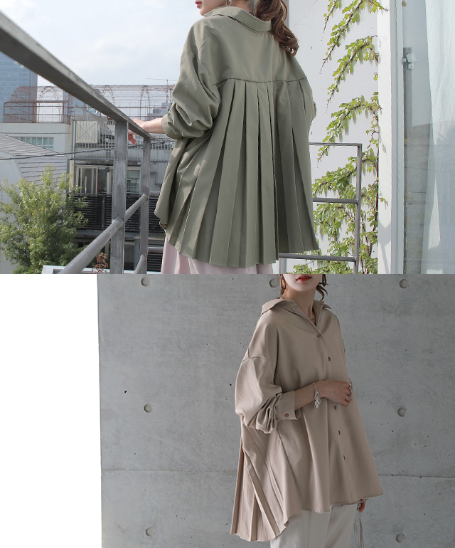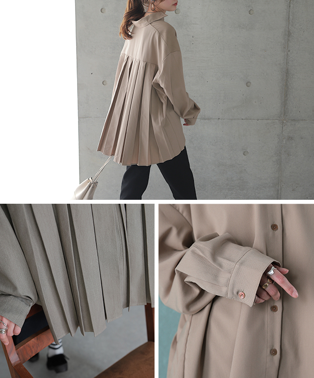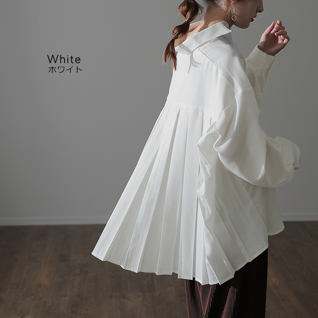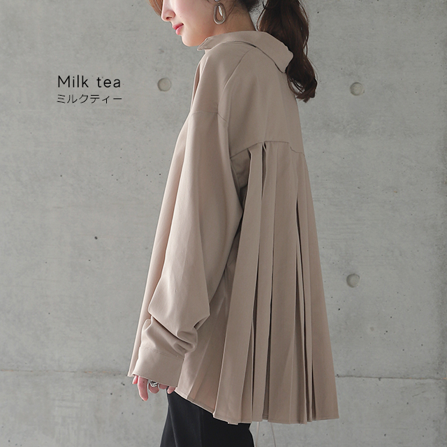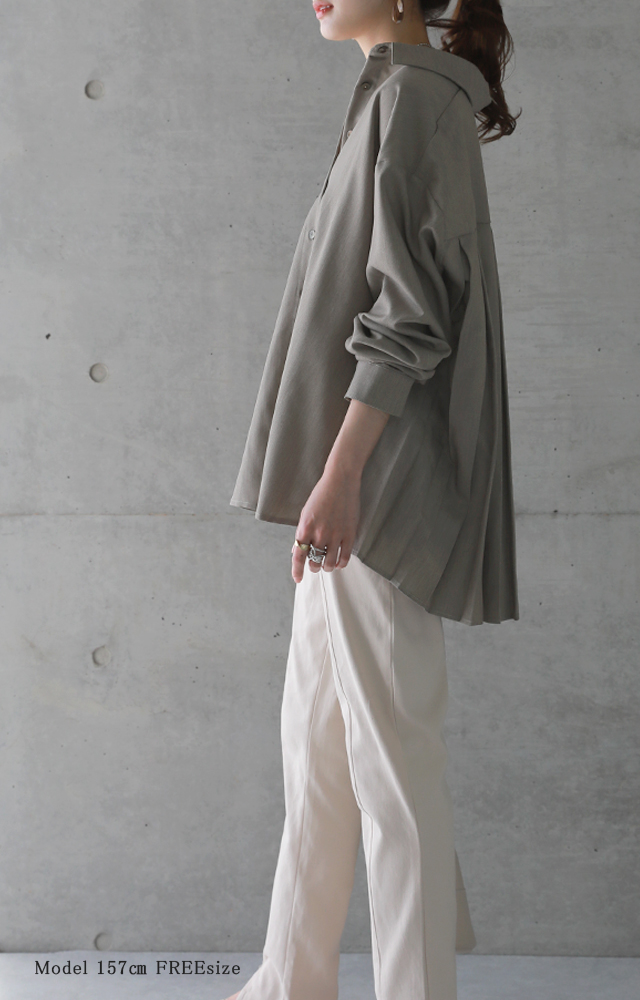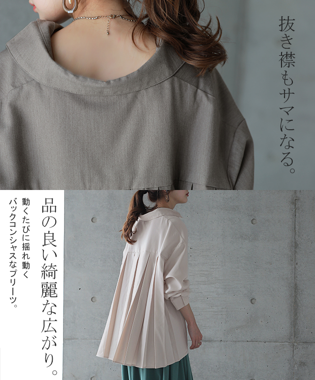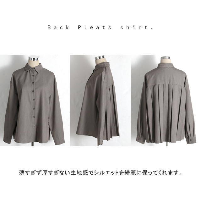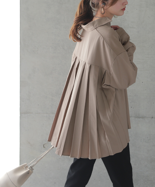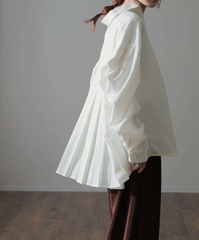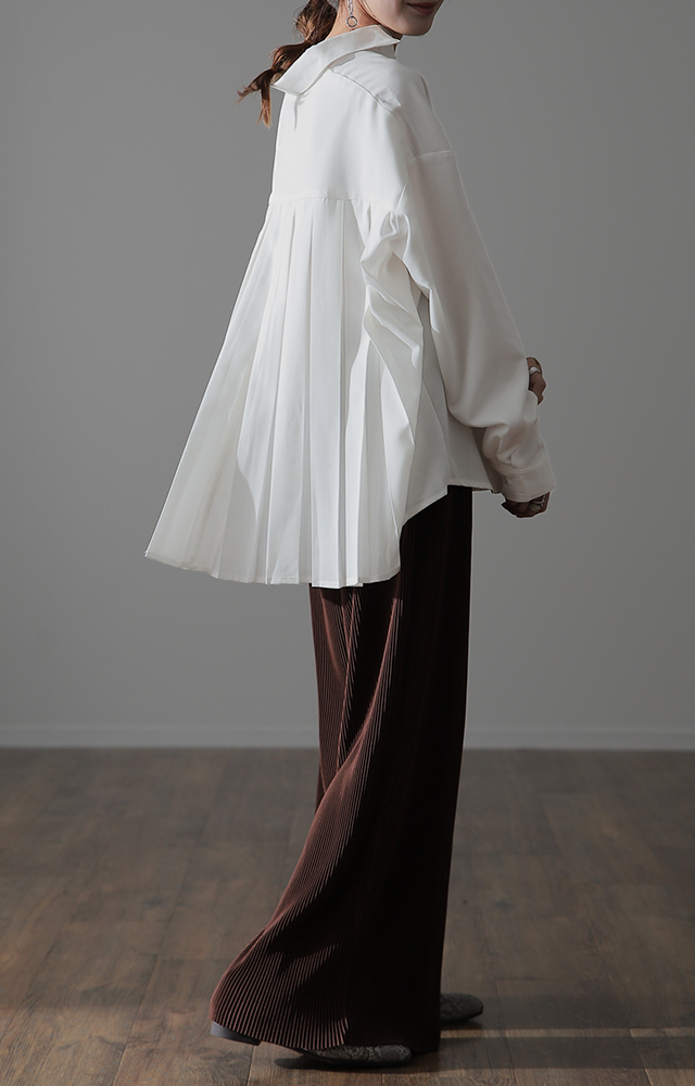 バックヨーク下をプリーツ加工したフレアシルエットのシャツ。