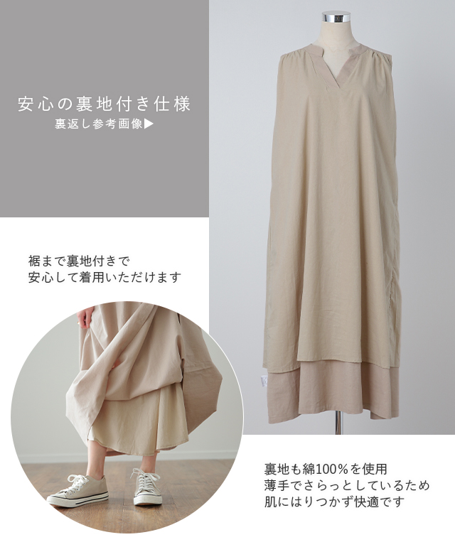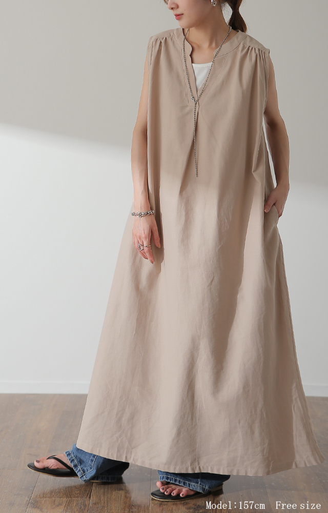 体をゆったり包む 綿100 ロングワンピース レディース ワンピ マキシ タンクトップ ノースリーブ タック コットン バンドカラー Vネック Aライン 体型カバー 大きいサイズ きれいめ リネン 麻 夏 秋 秋新作