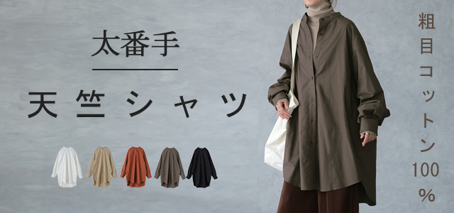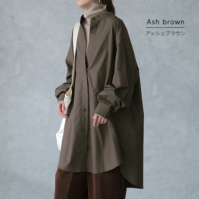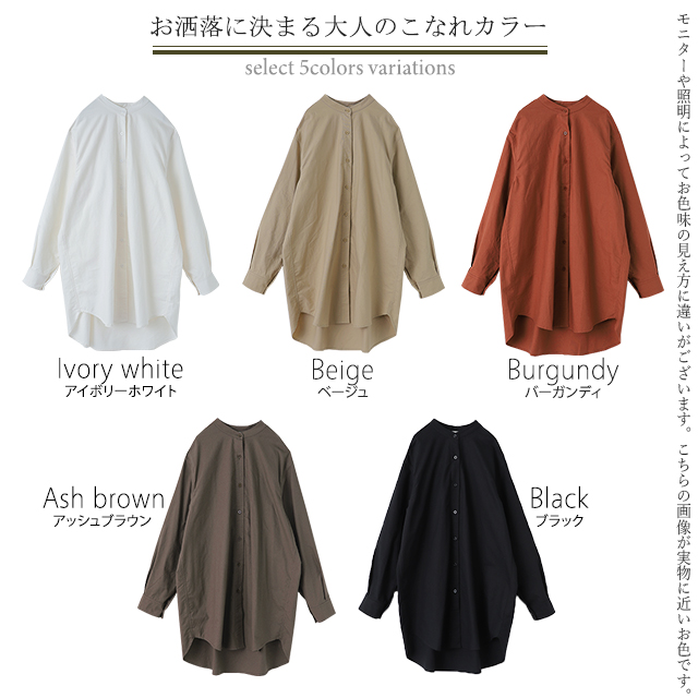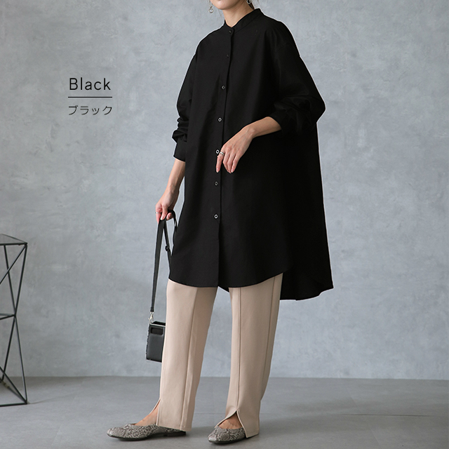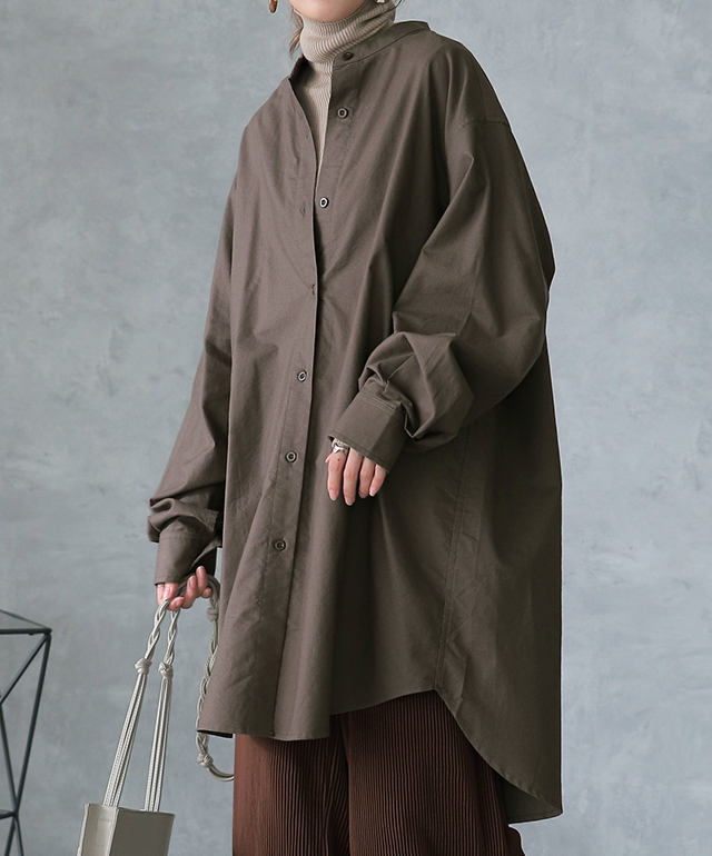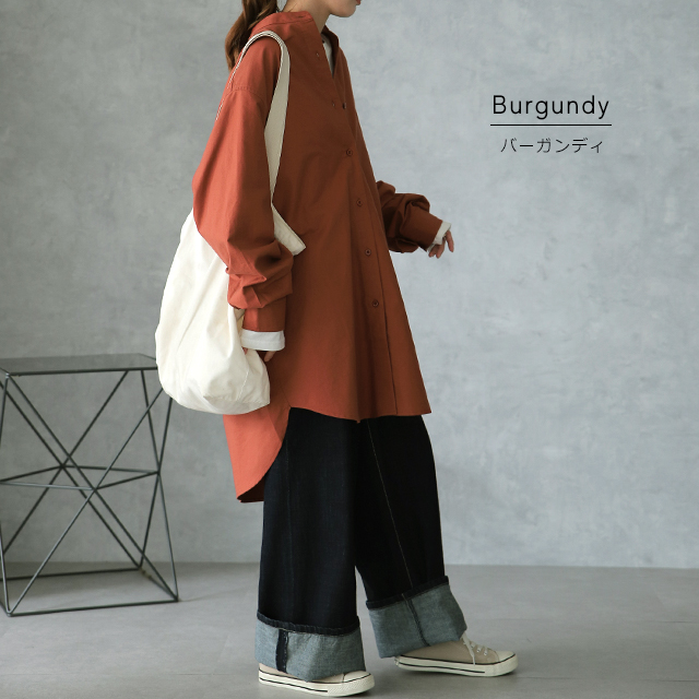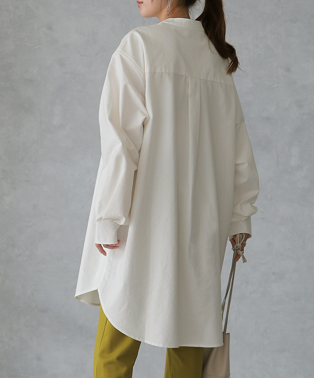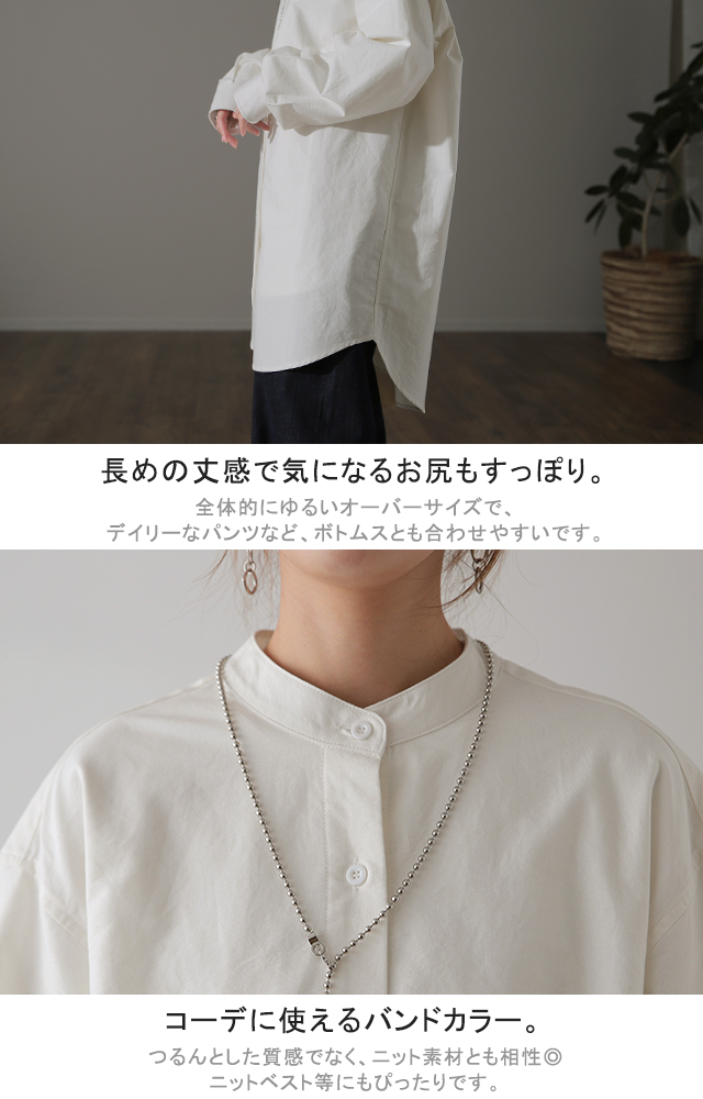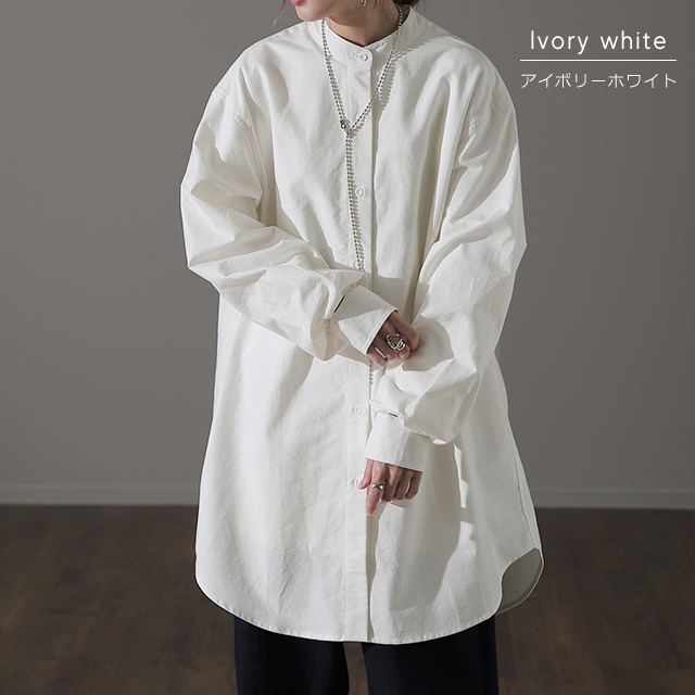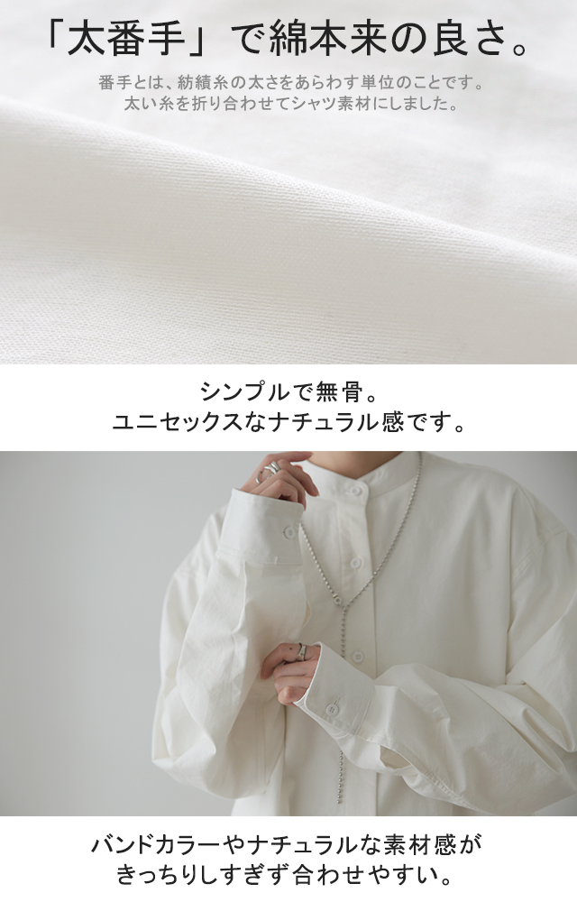 ガシっと太番手「 シャツ 」 バンドカラー トップス 一部1月中旬入荷 ナチュラル ノーカラー ロング ロングシャツ ブラウス チュニック オーバーサイズ 綿 コットン 100% 長袖 レディース 厚手 白 無地 冬 秋 秋新作