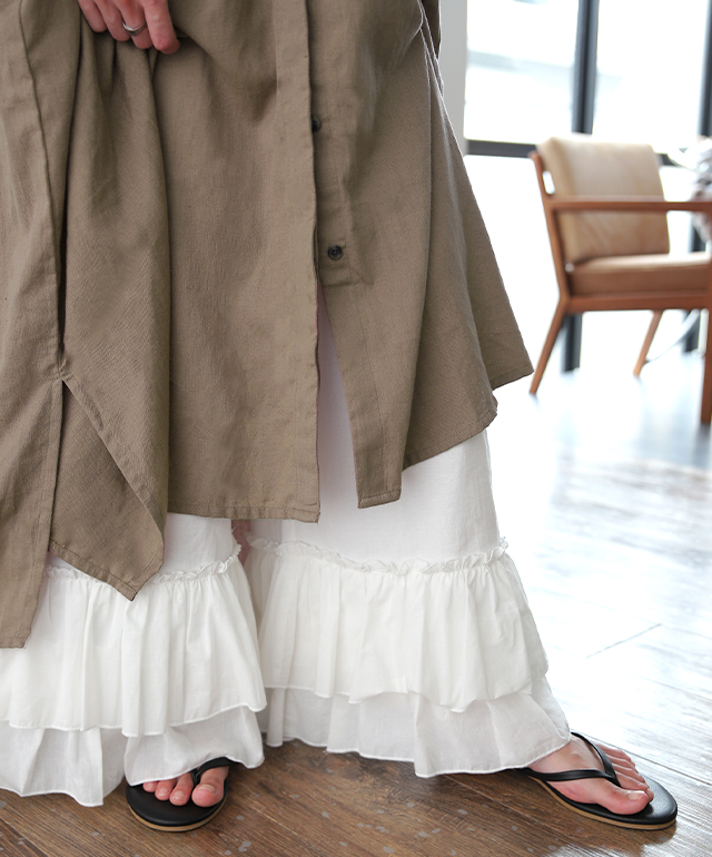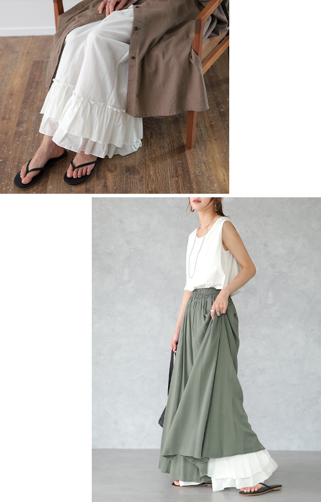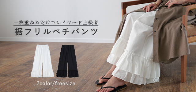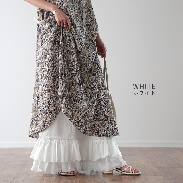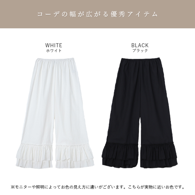 天然素材「裾フリルパンツ」 ペチパンツ レディース パンツ ペチコート レイヤード ボトムス フリル インナー ワイドパンツ レース 重ね着 ロング マキシ 下着 体型カバー ウエストゴム コットン 大きいサイズ 冬 秋 秋新作