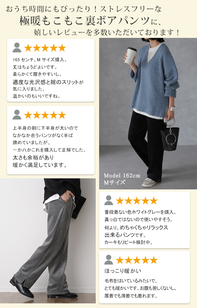 - 見るからに暖かそうで、はいても暖かかったです。ウエストもゴムではきやすいです。ちょっと丈が気持ち長すぎたかな。あーいった感じのパンツは、どうしても下のほうが重たくなってしまうのは、仕方ないですかね。