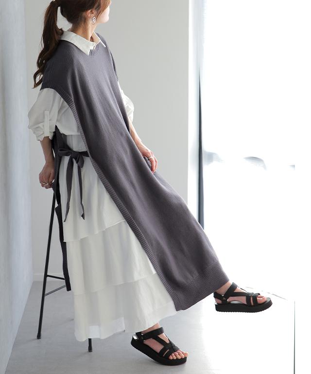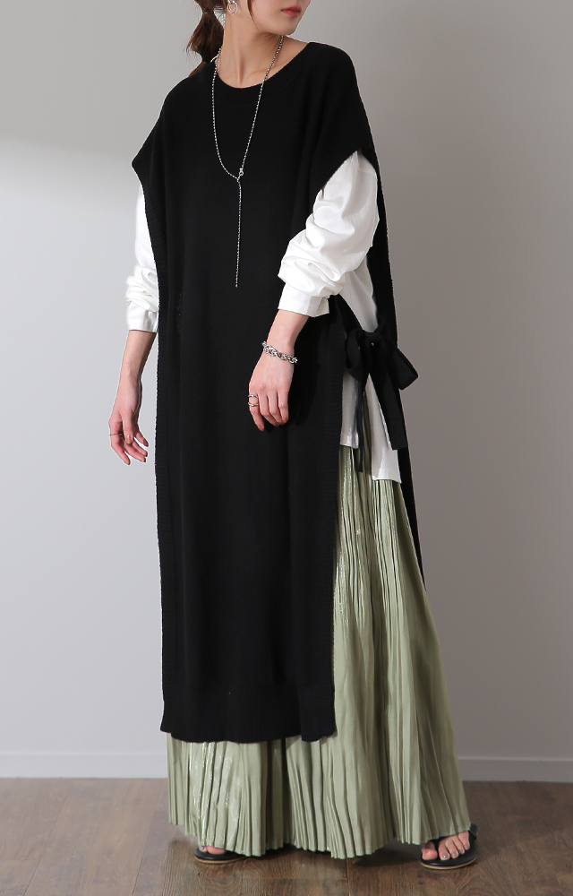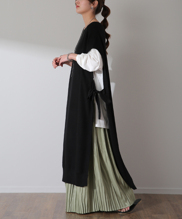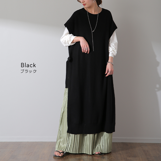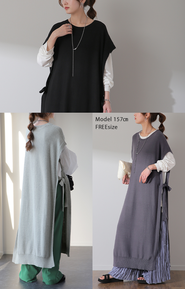 「 体型カバー 」ストンと隠せる ワンピ ニット ベスト レディース レイヤード セーター ロング スリット リボン 重ね着 Uネック ワンピース マキシ 薄手 ジレ ビッグ 黒 ブラック 大きいサイズ 冬 秋 秋新作